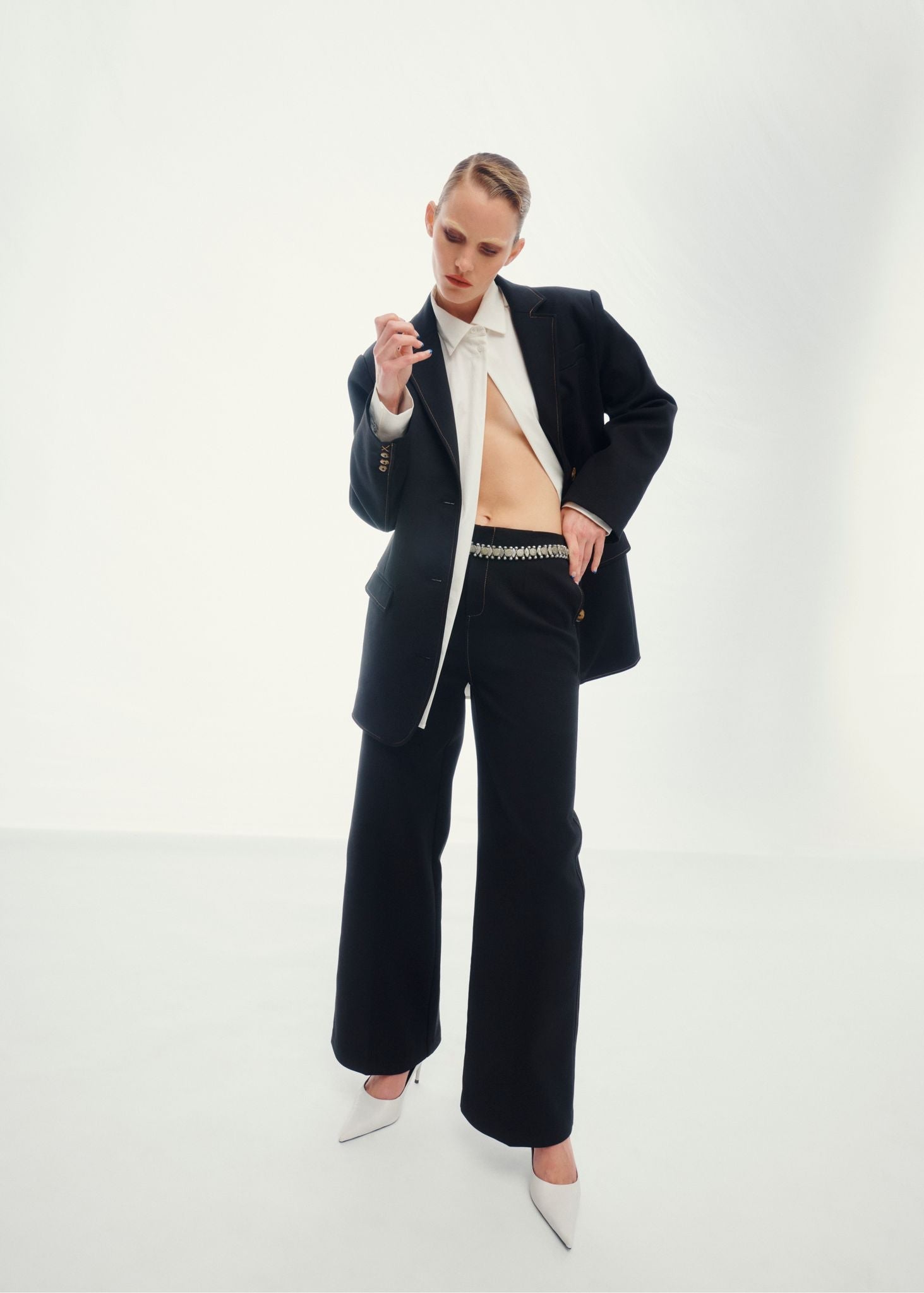 Emily wears our Andre blazer, Lester open shirt and Maxine pant.