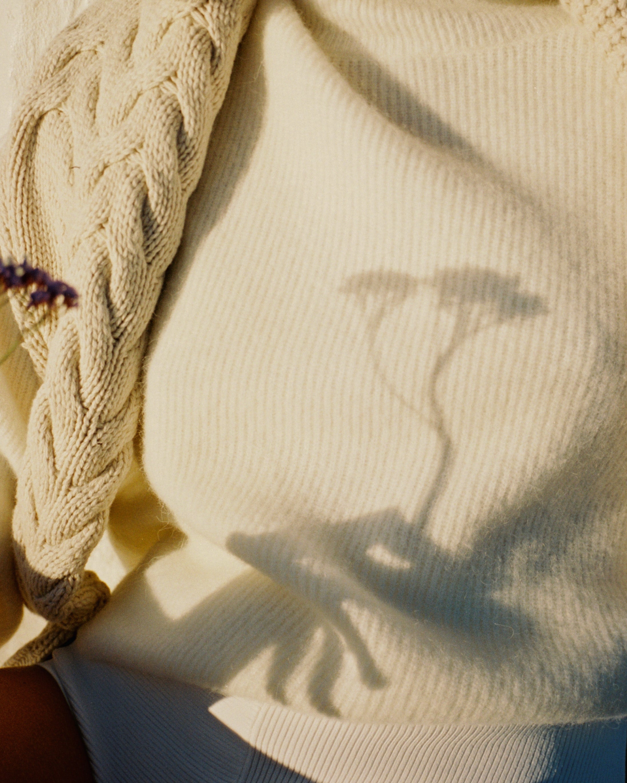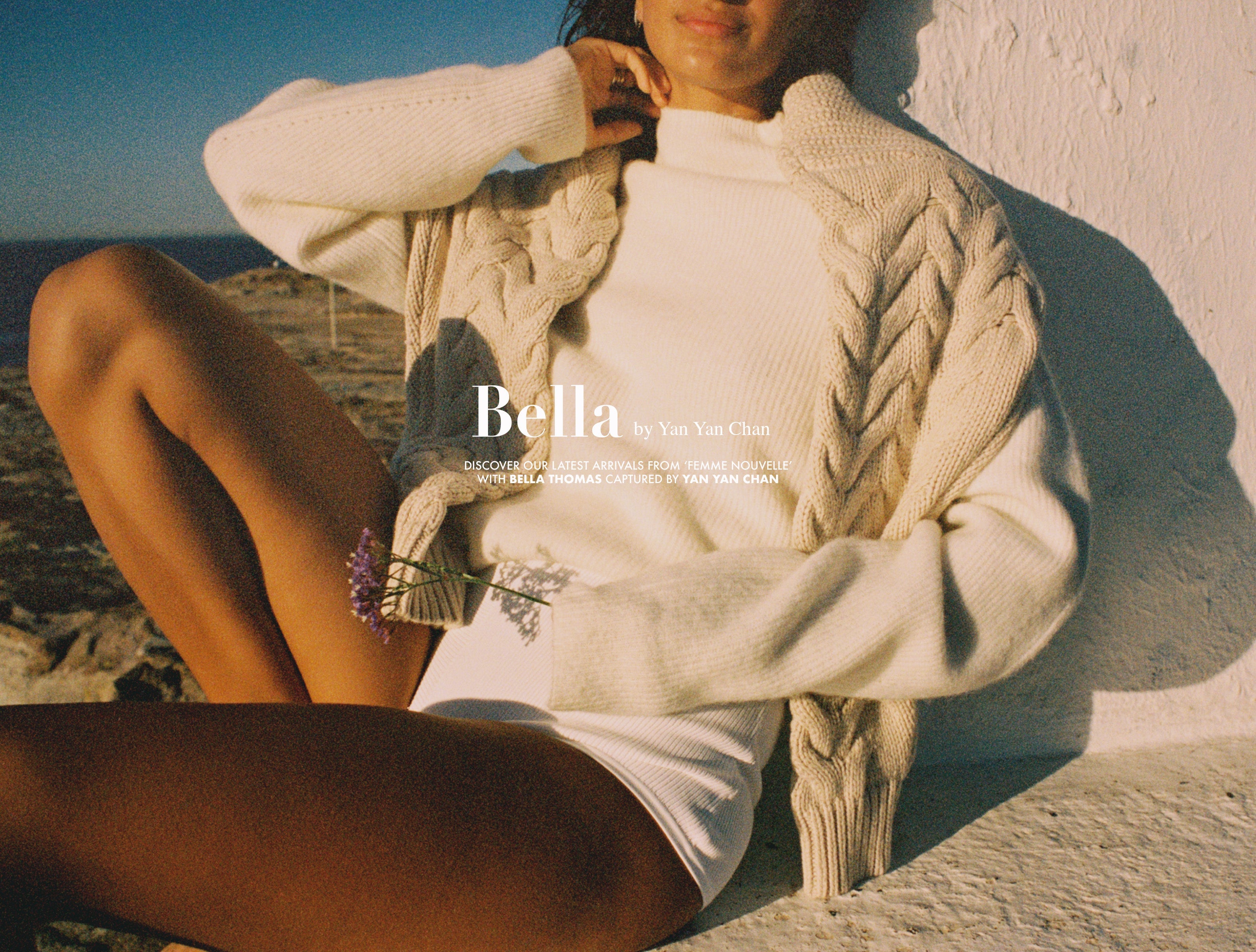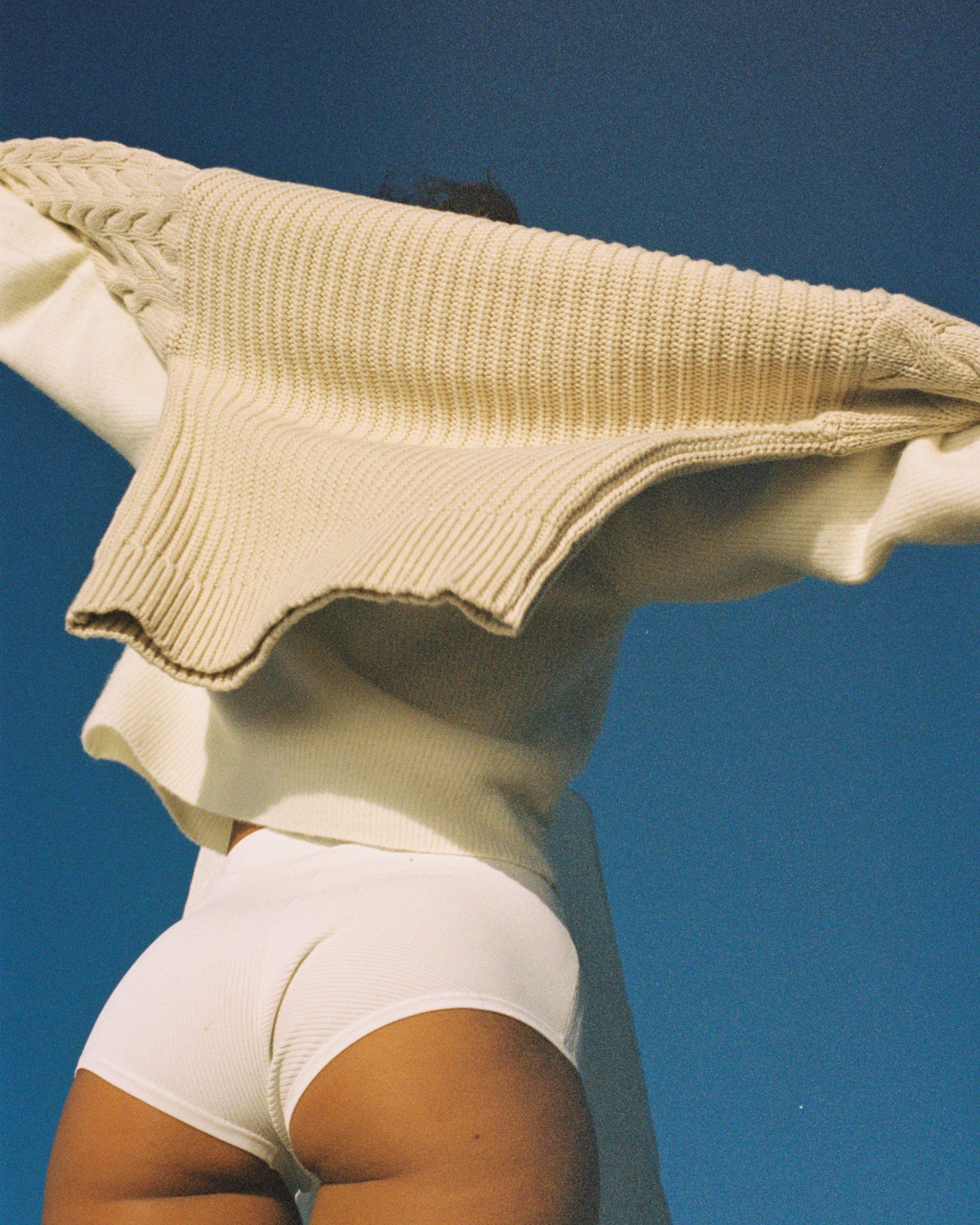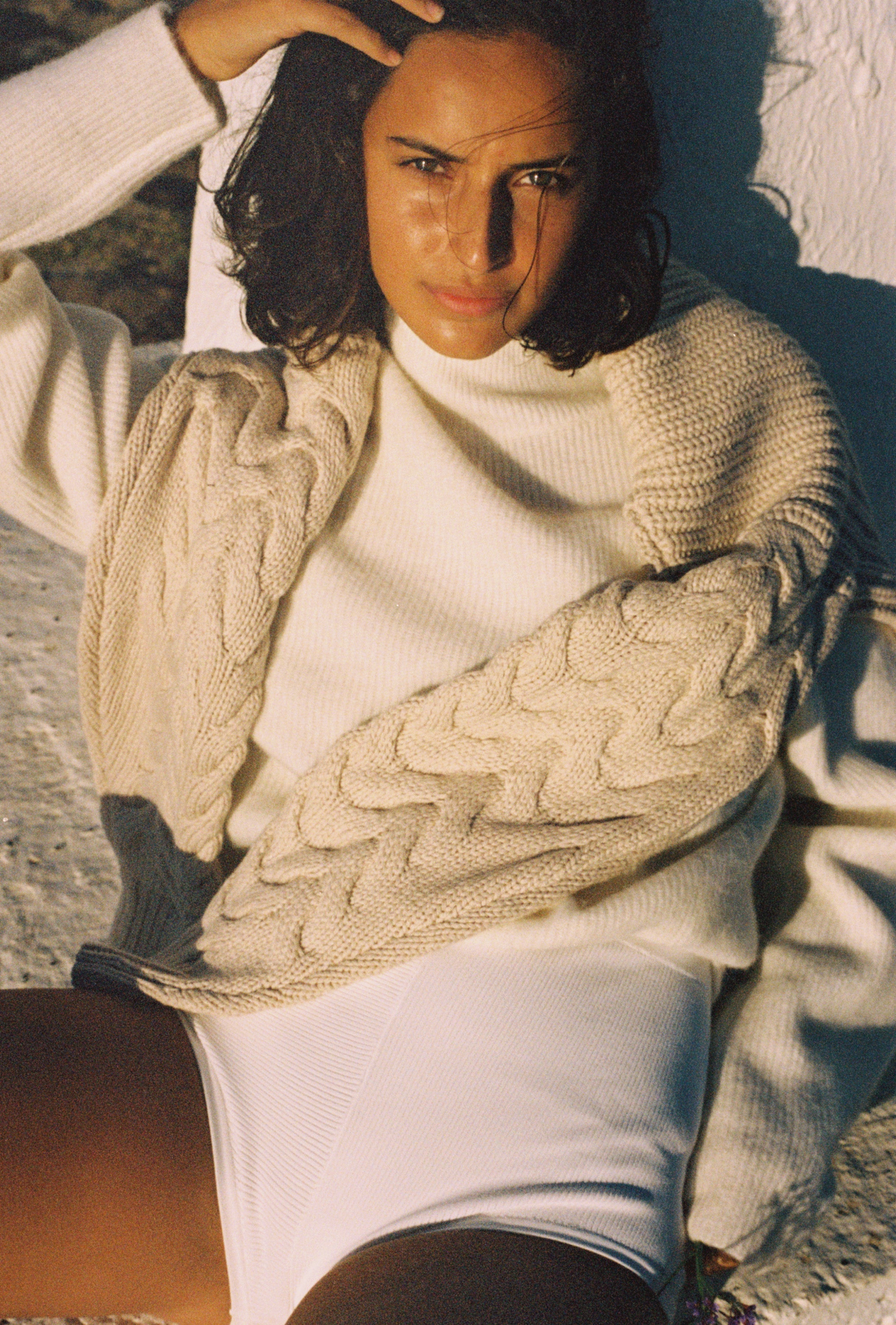 Bella wears the Ava High Neck Sweater and the Annika Brief