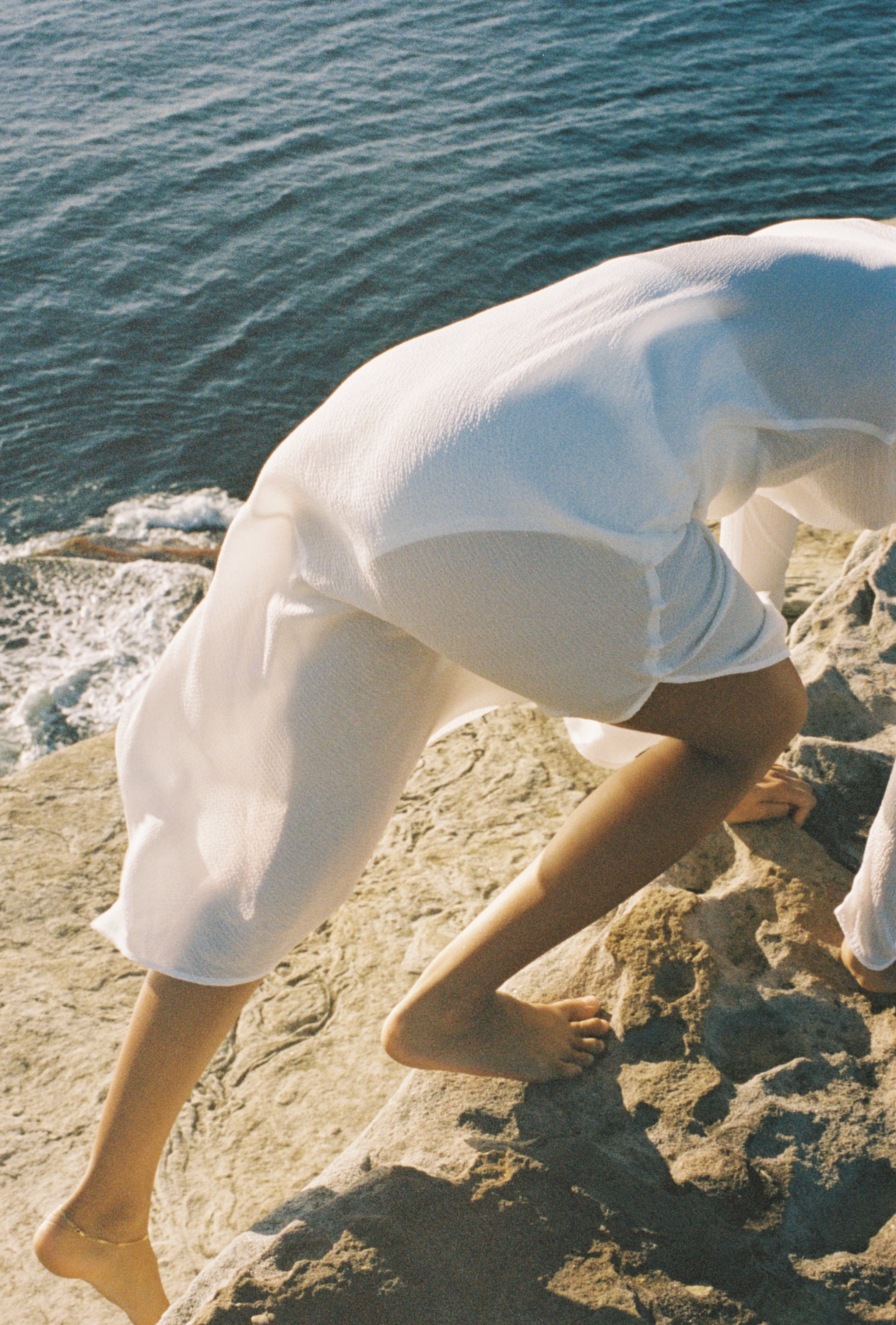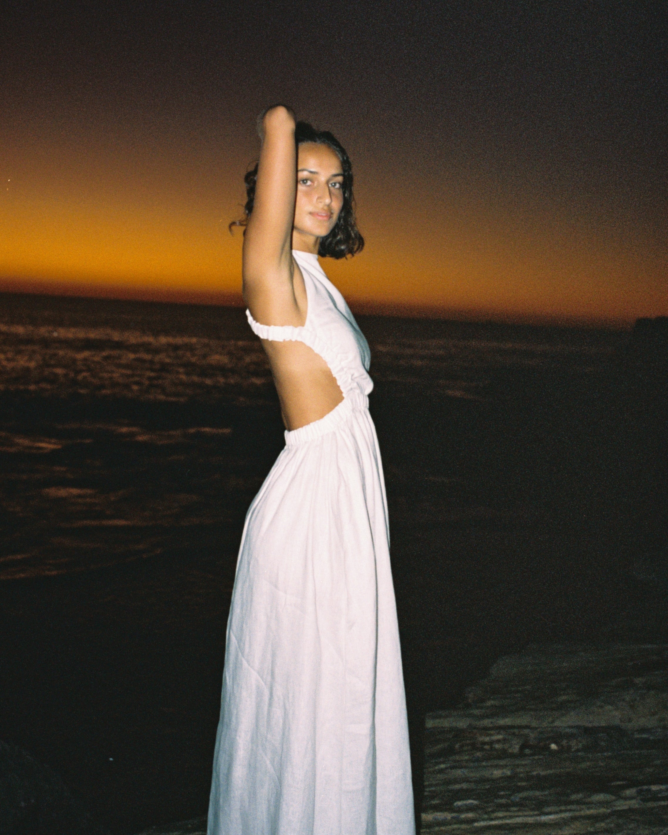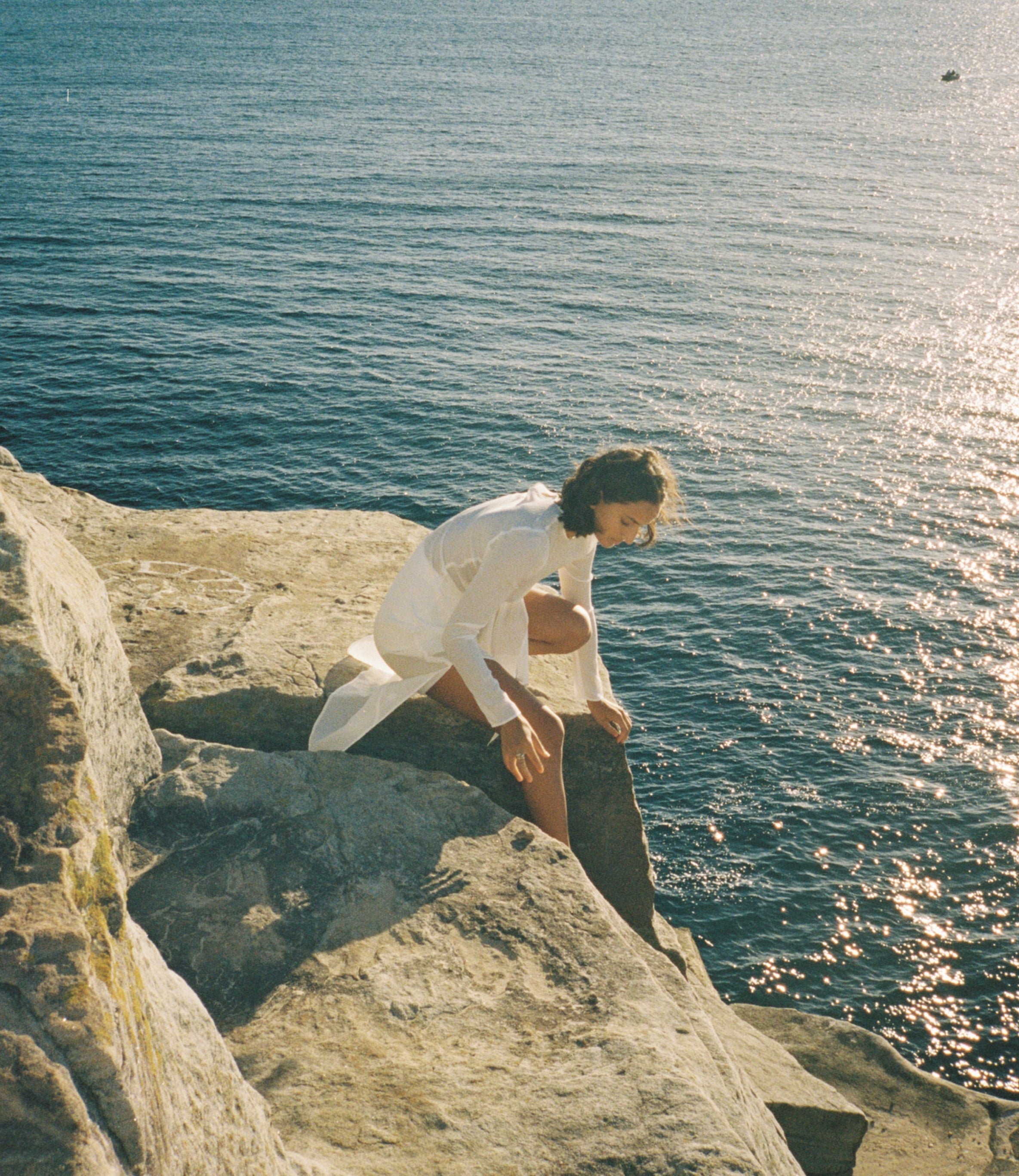 Bella wears the Ava High Neck Sweater and the Annika Brief