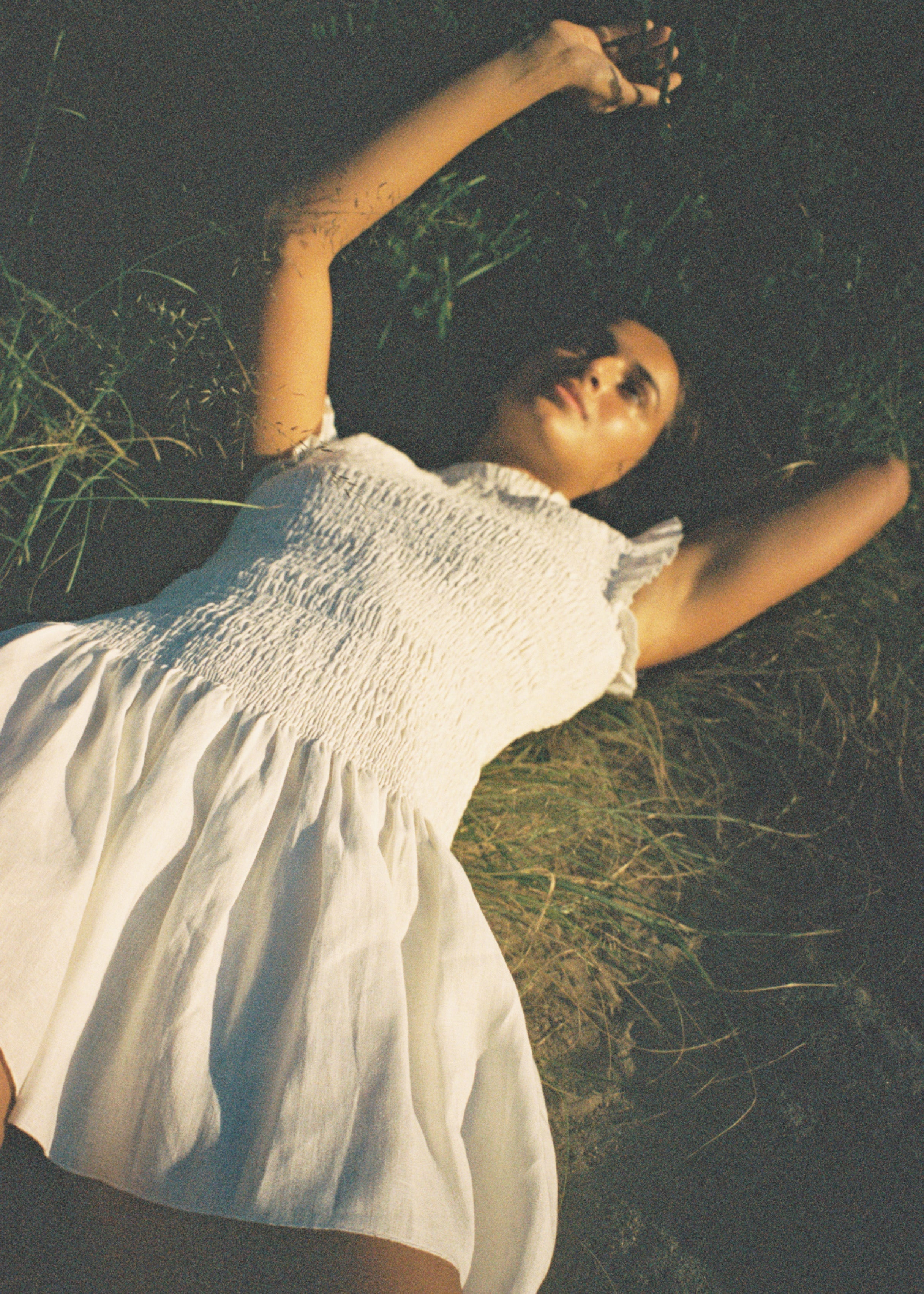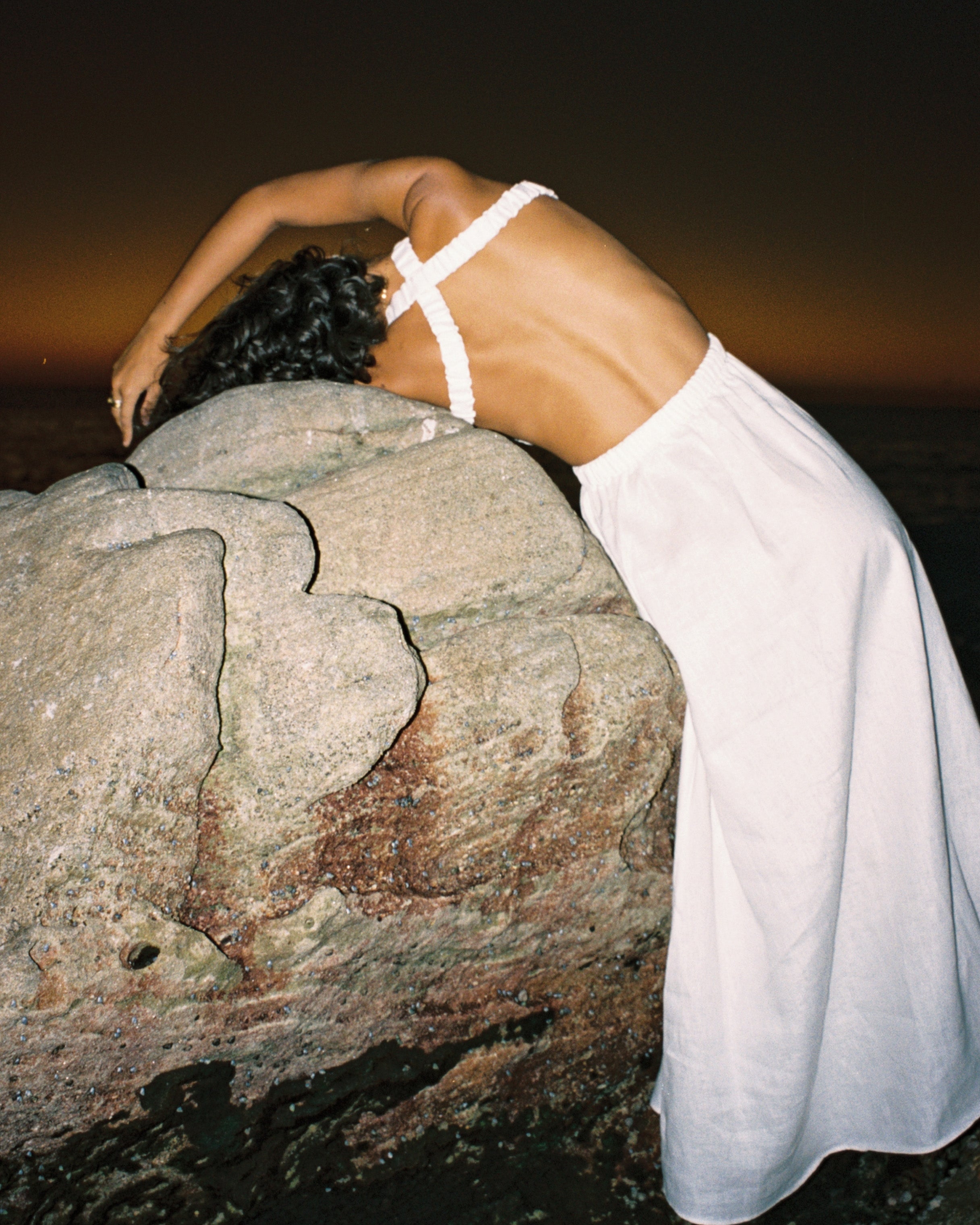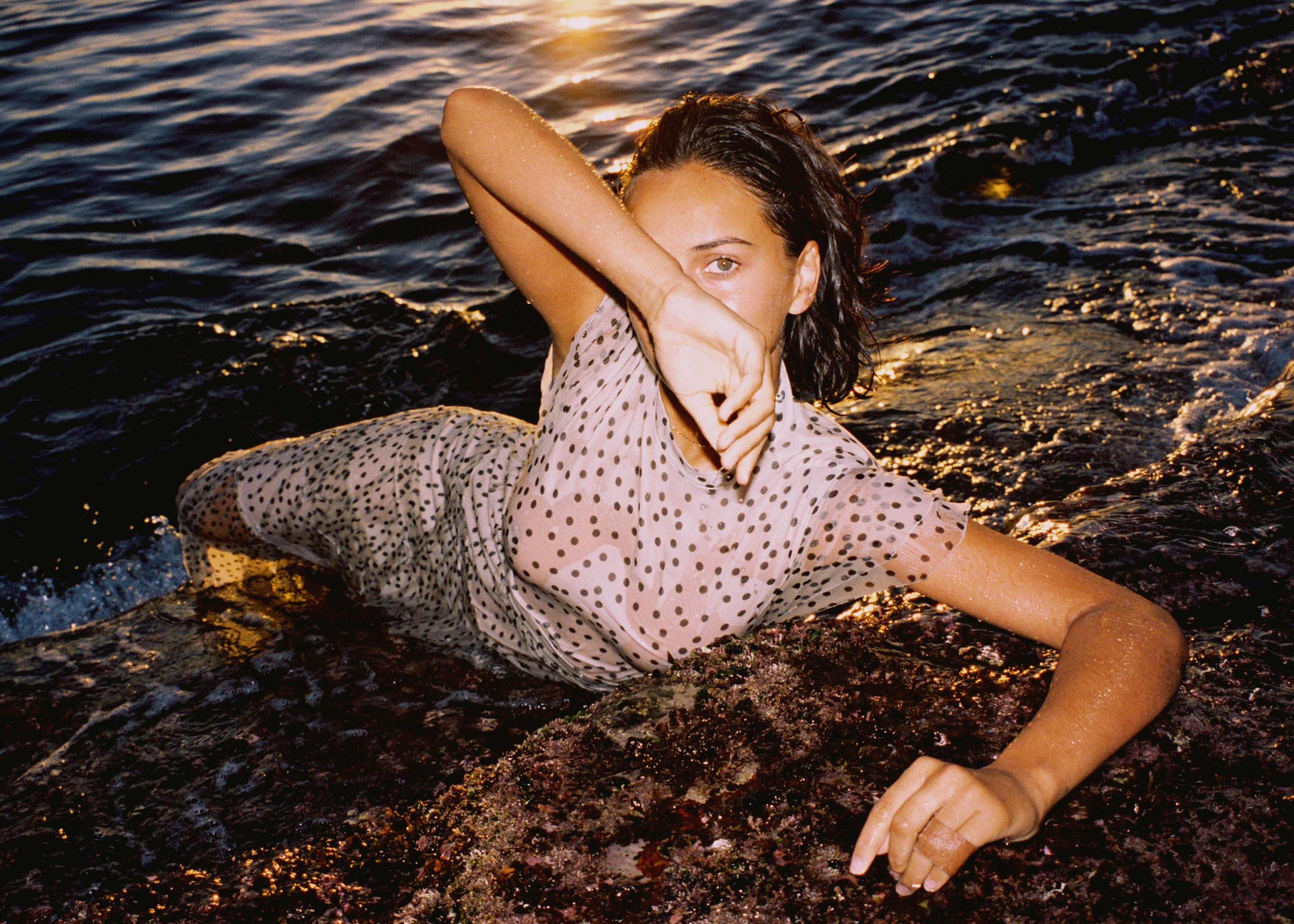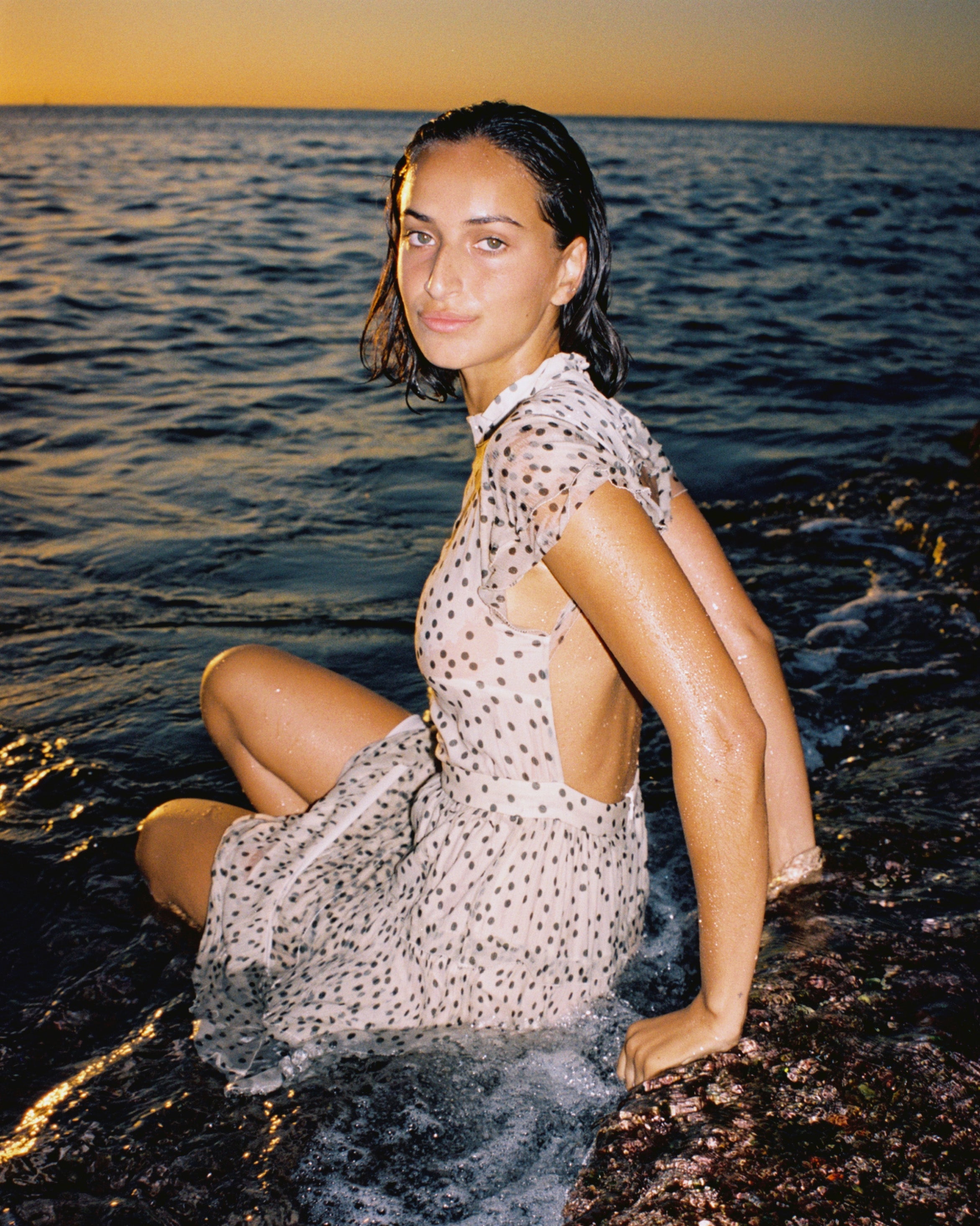Bella wears the Ava High Neck Sweater and the Annika Brief