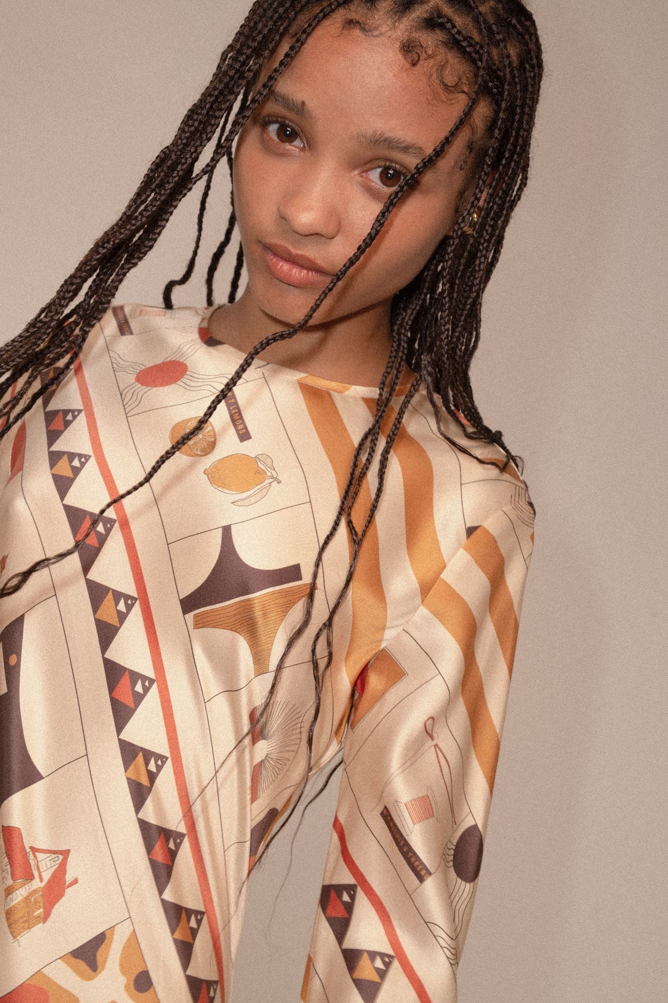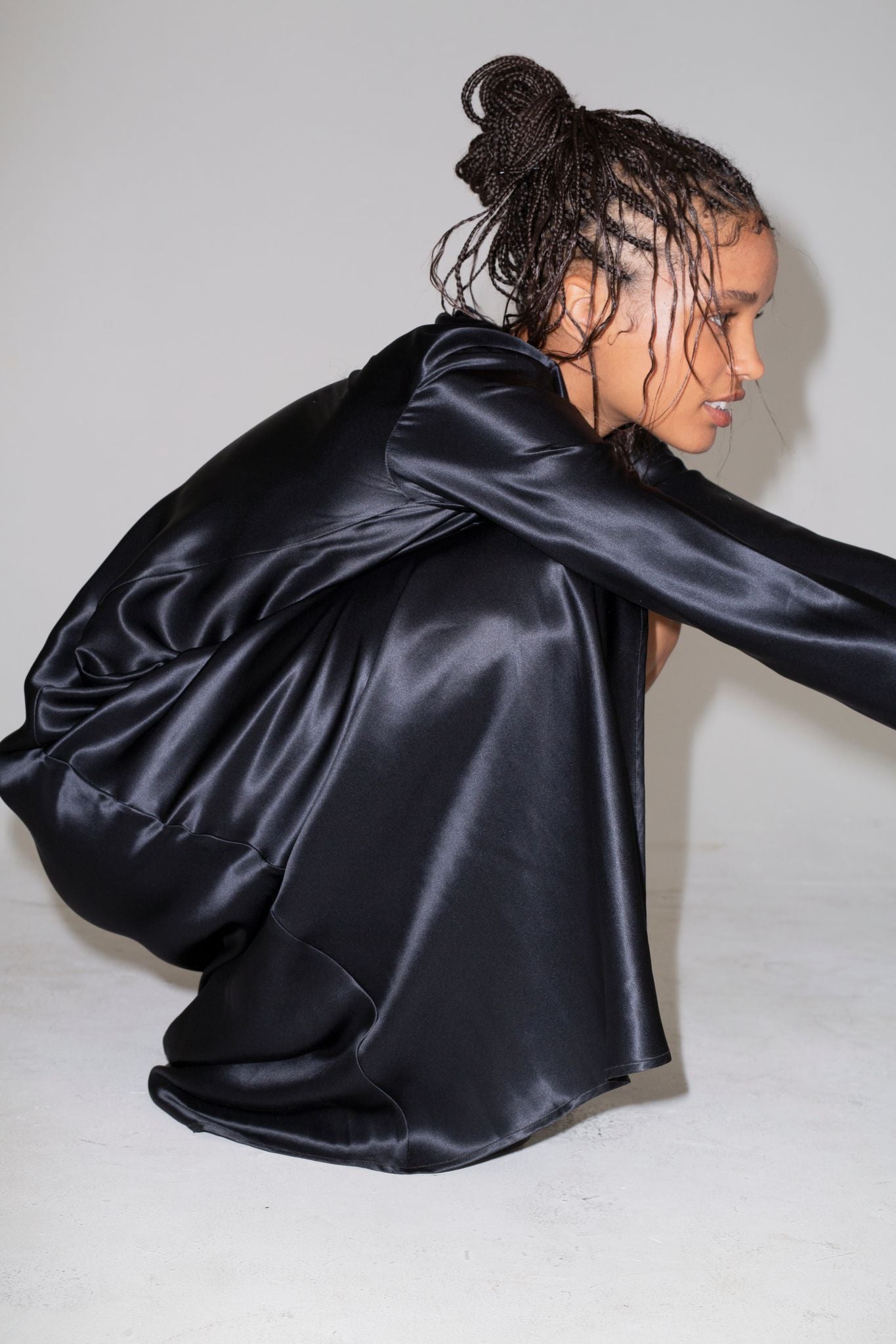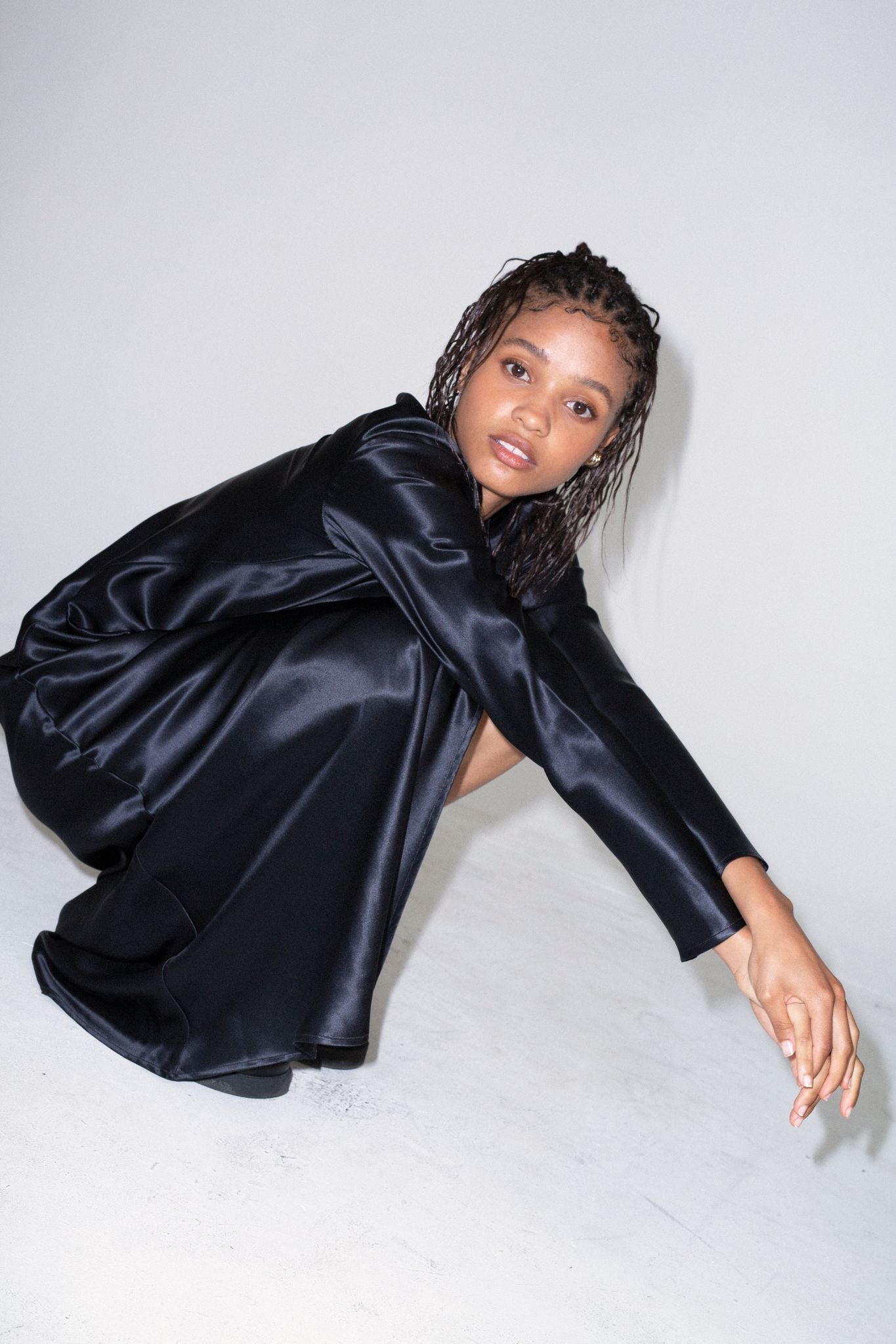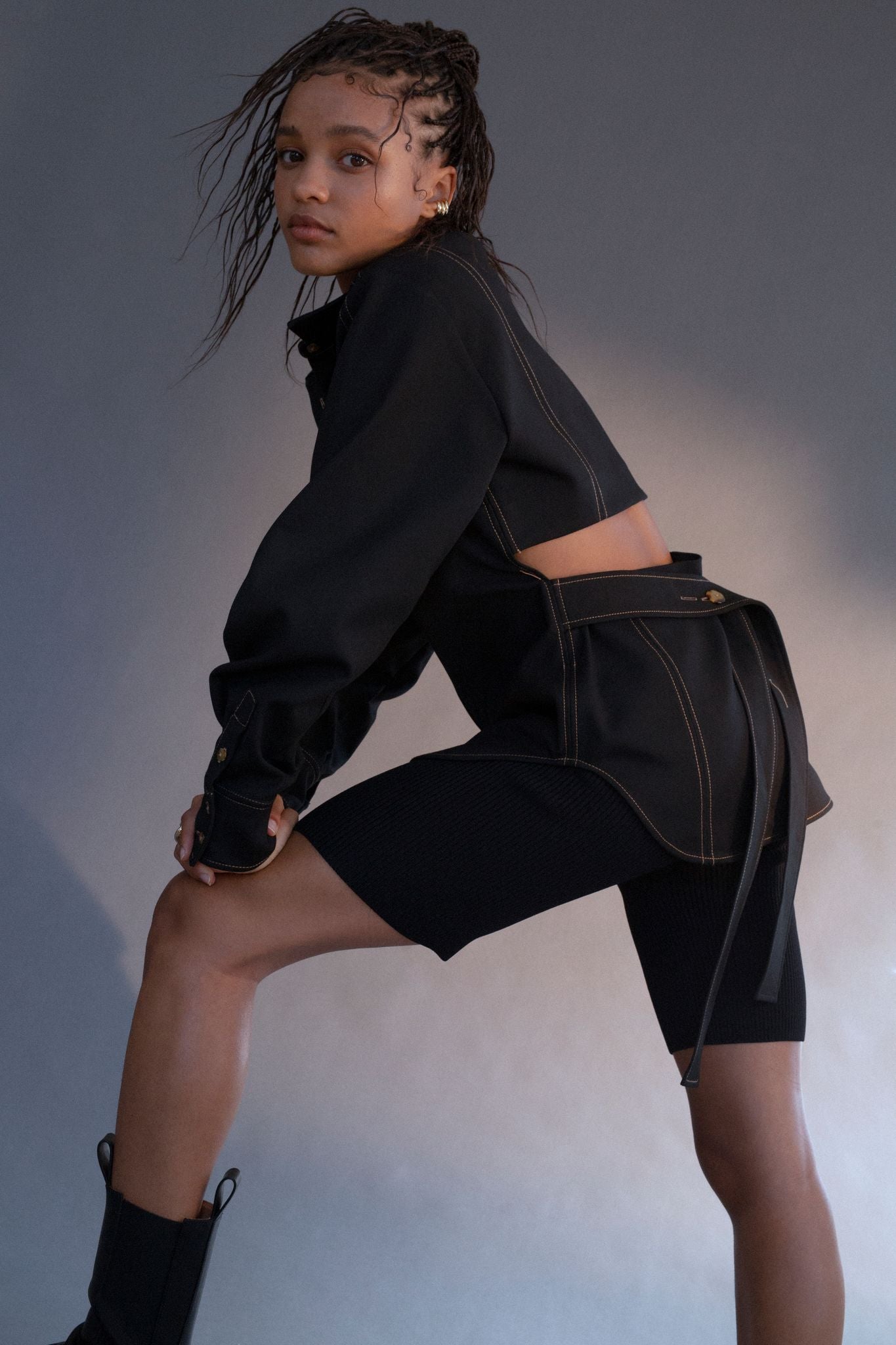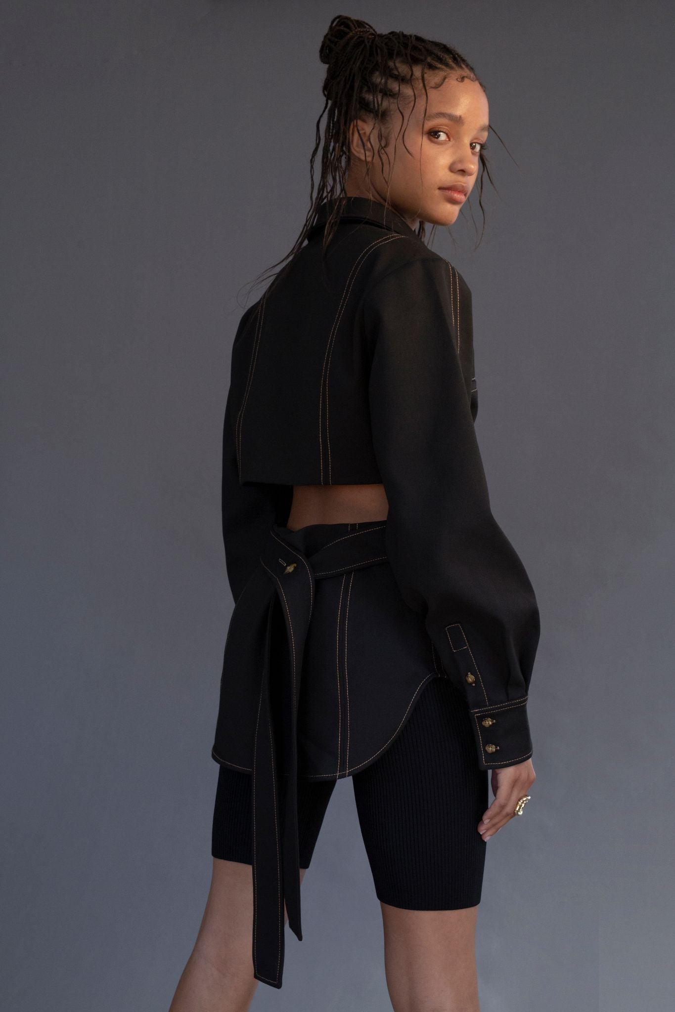 Crystal in our Andre open back shirt