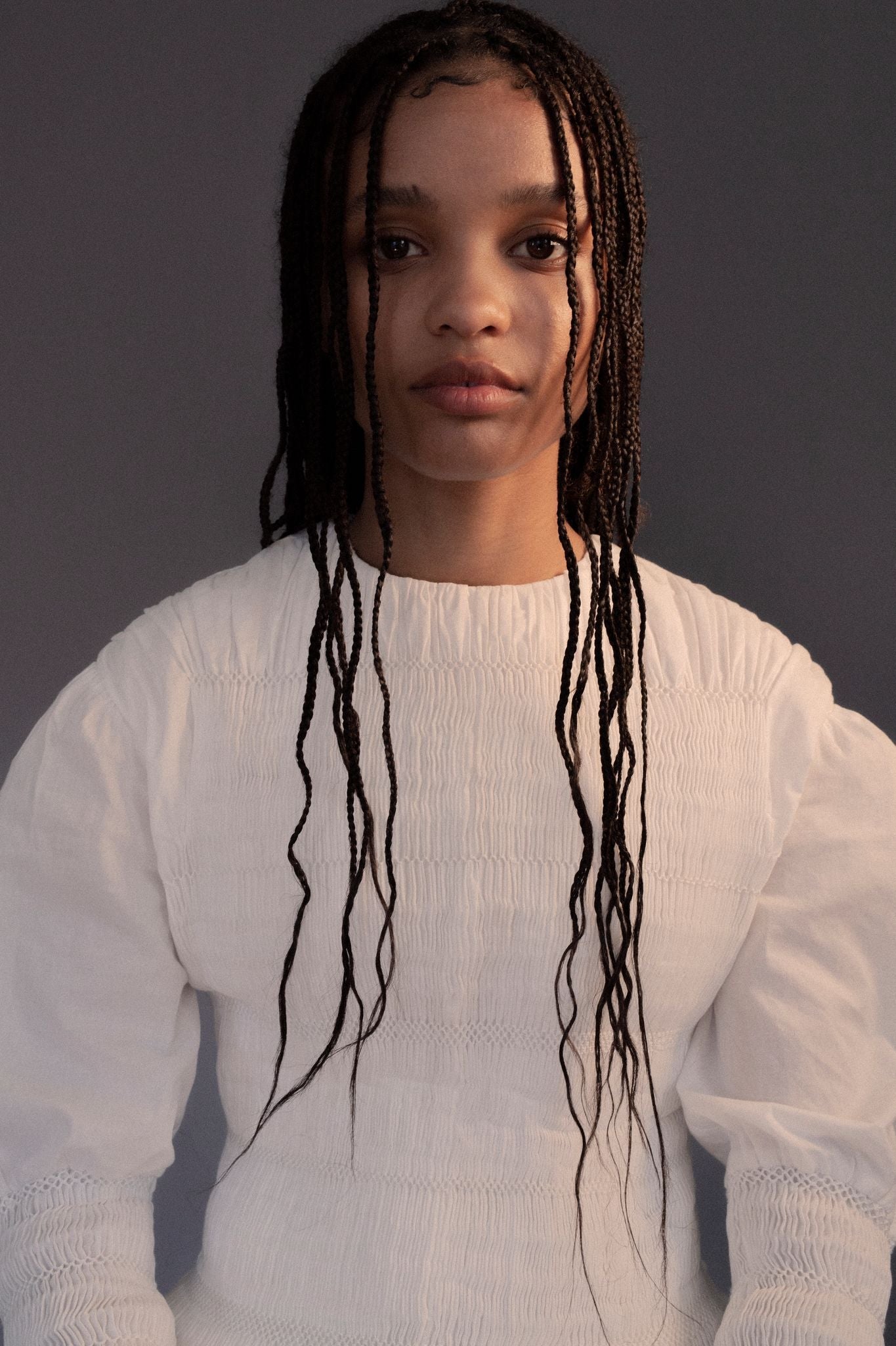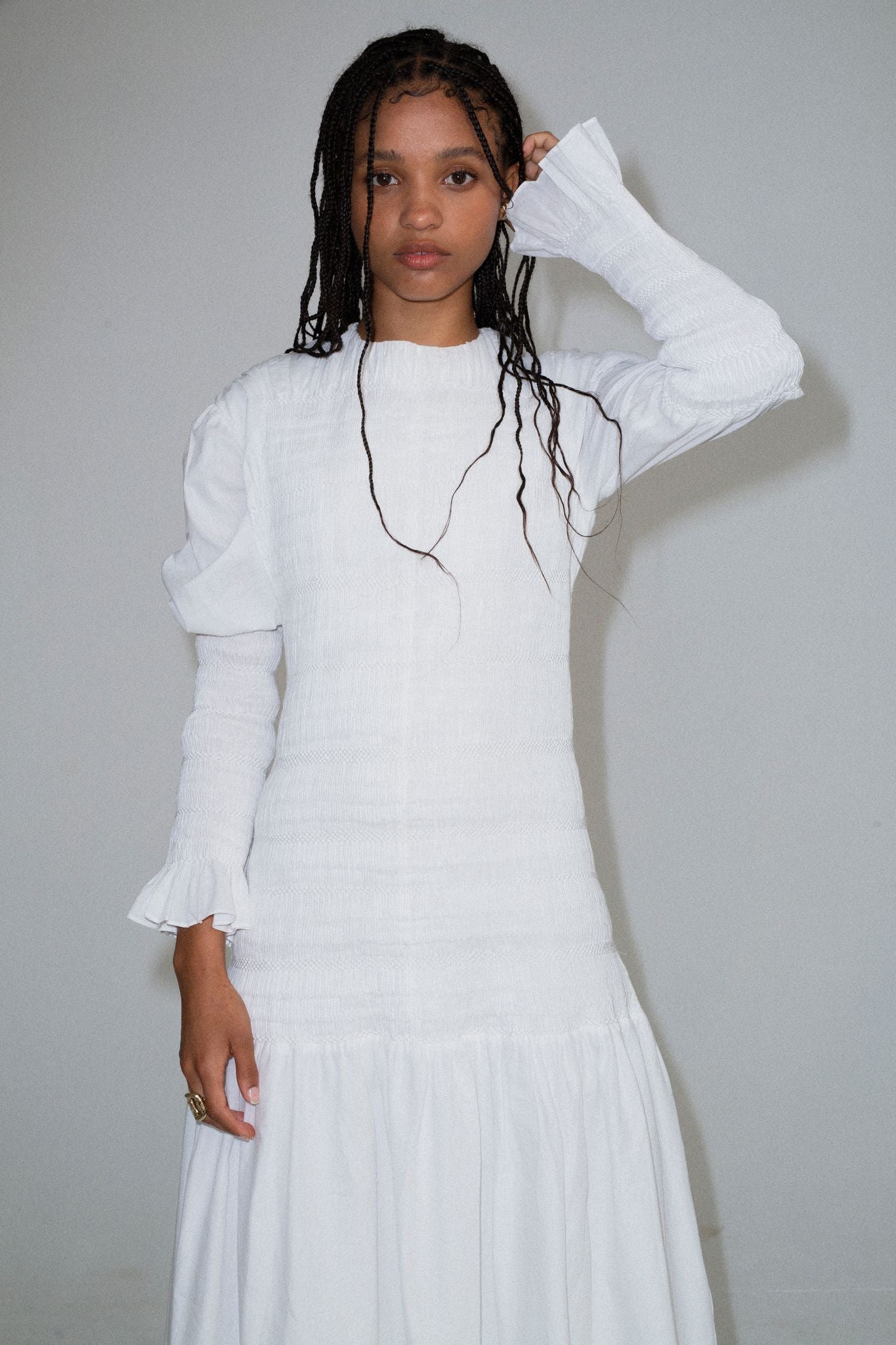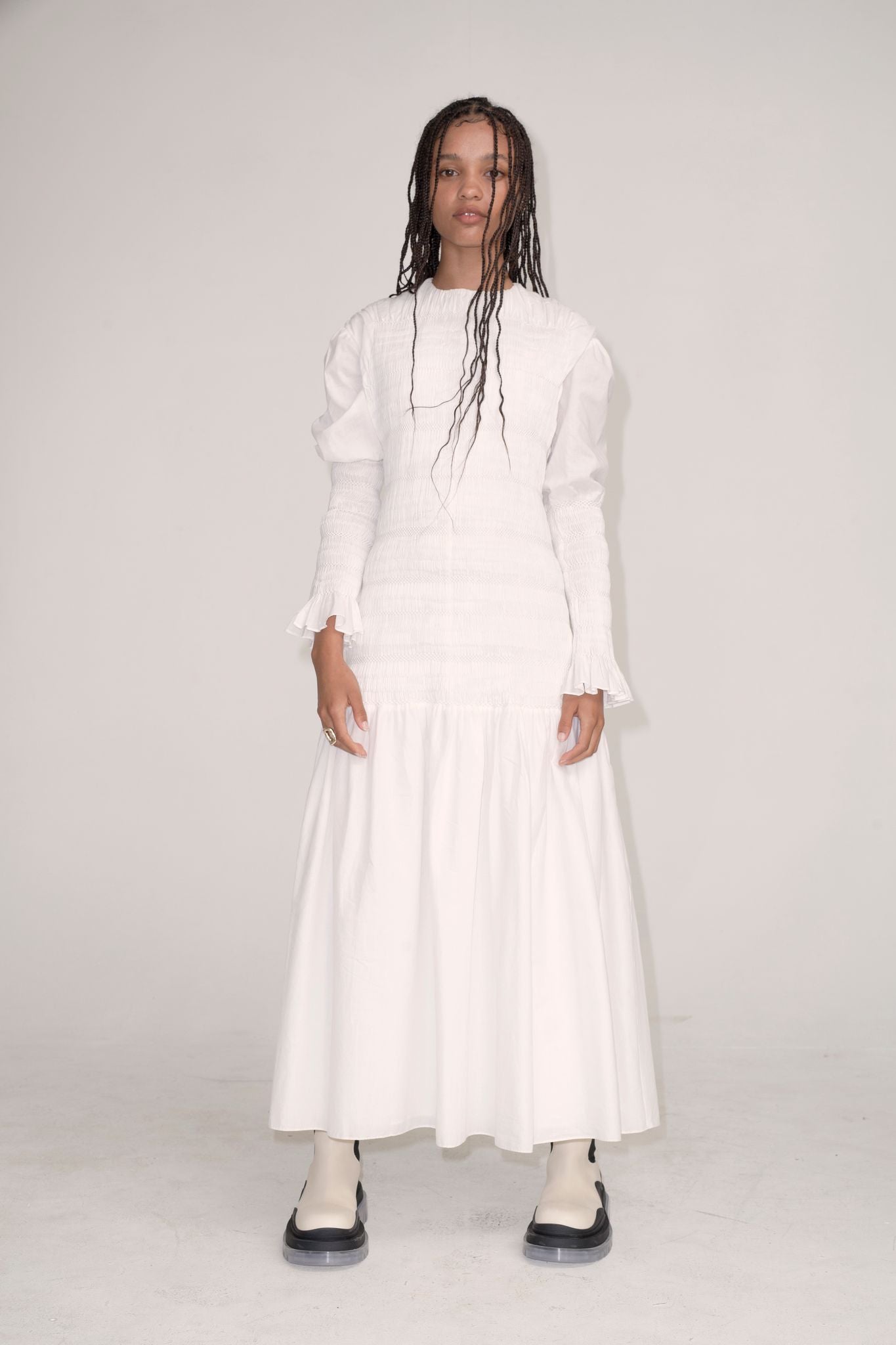 Crystal in our Cecil long sleeve smocked gown