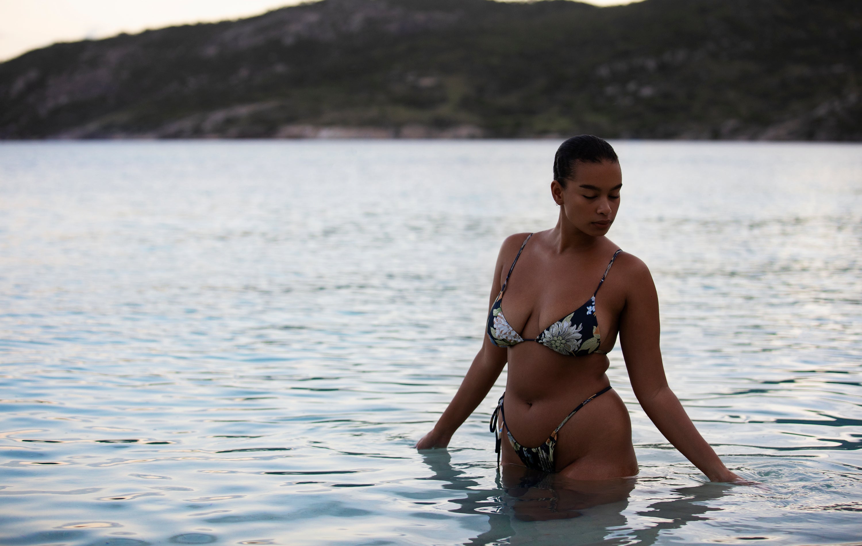 Tahnee wears the Gia One Piece. Joanna wears the Gia Top and Gia High Waisted Brief. Shenise wears the Gia Triangle Top and Gia Bikini Brief.