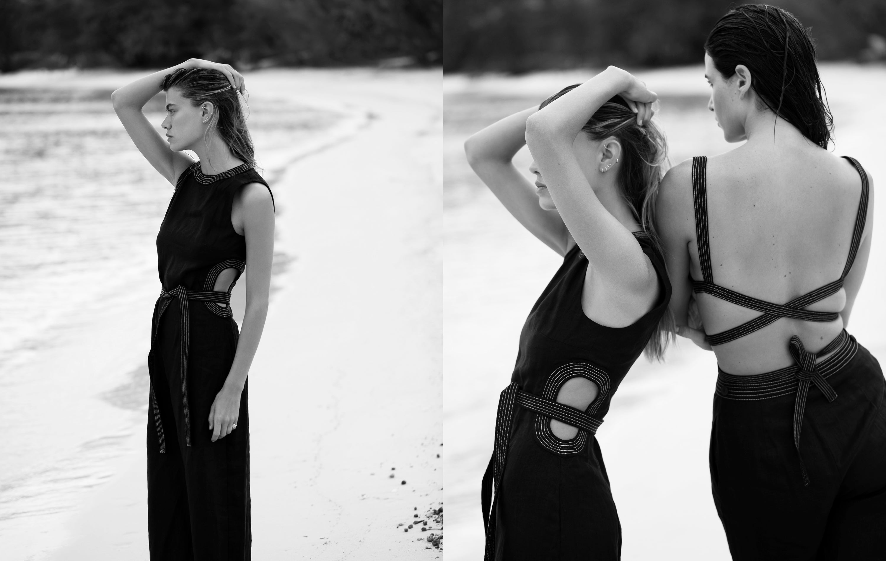 Tahnee wears the Enid String Triangle Top and Isobel Wrap Dress. Shimma wears the Enid One Piece.
