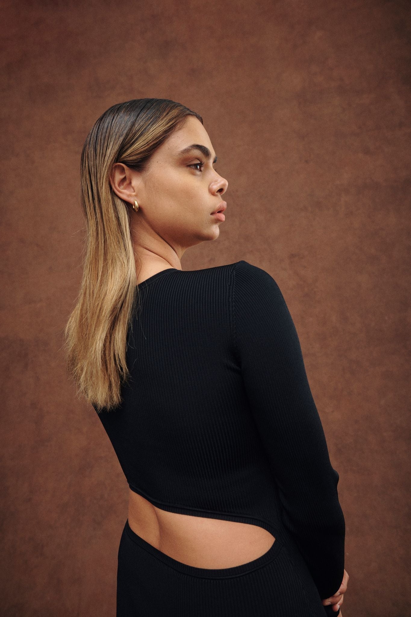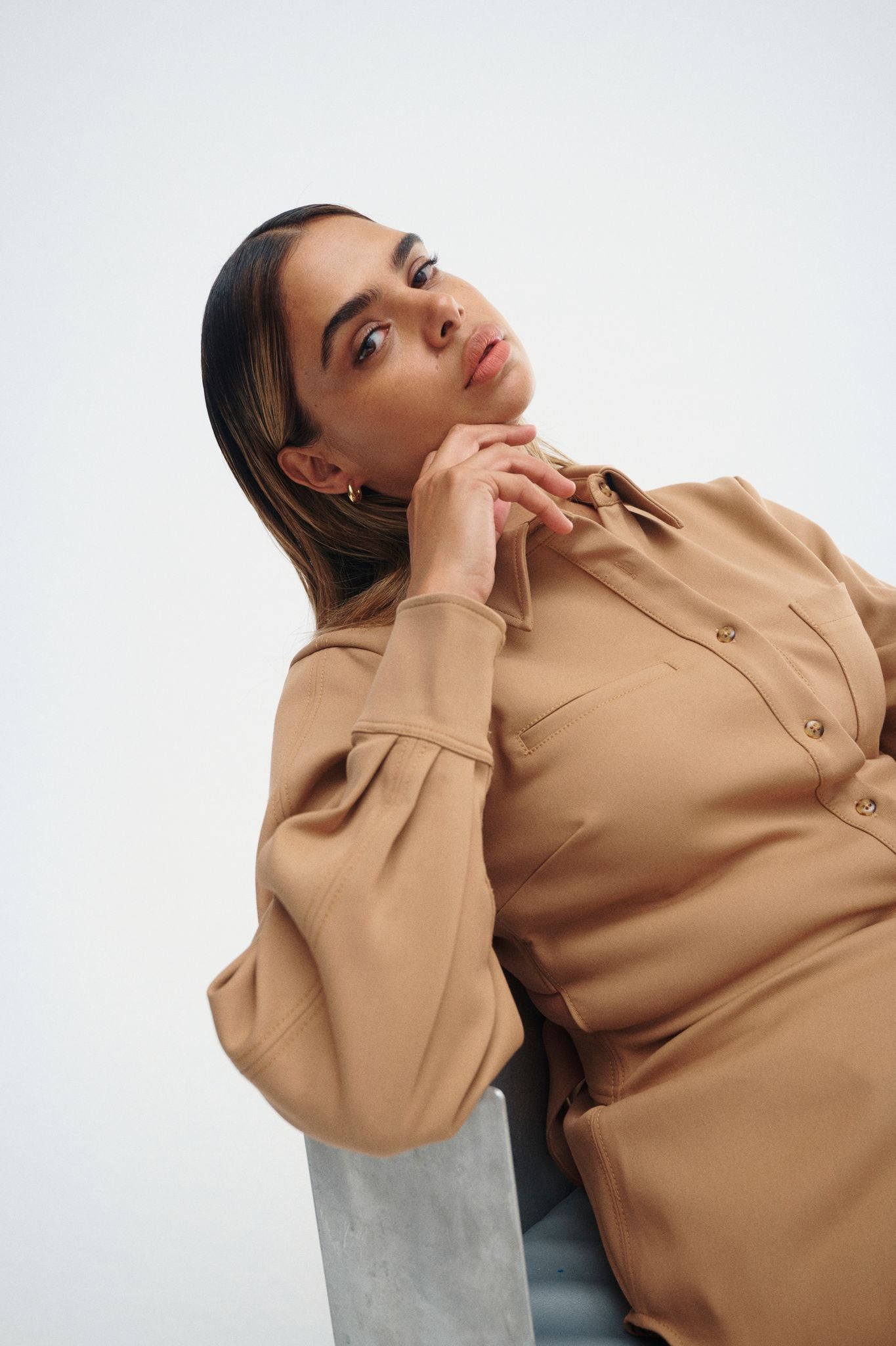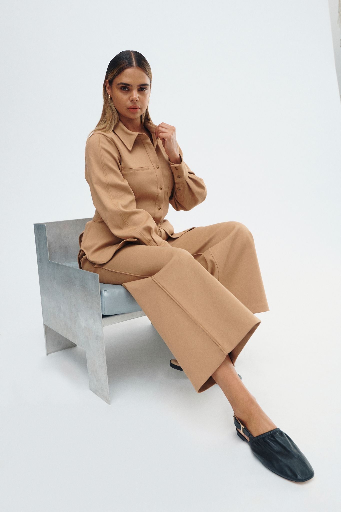 Sam wears our Andre open back shirt and Andre wide leg pants.