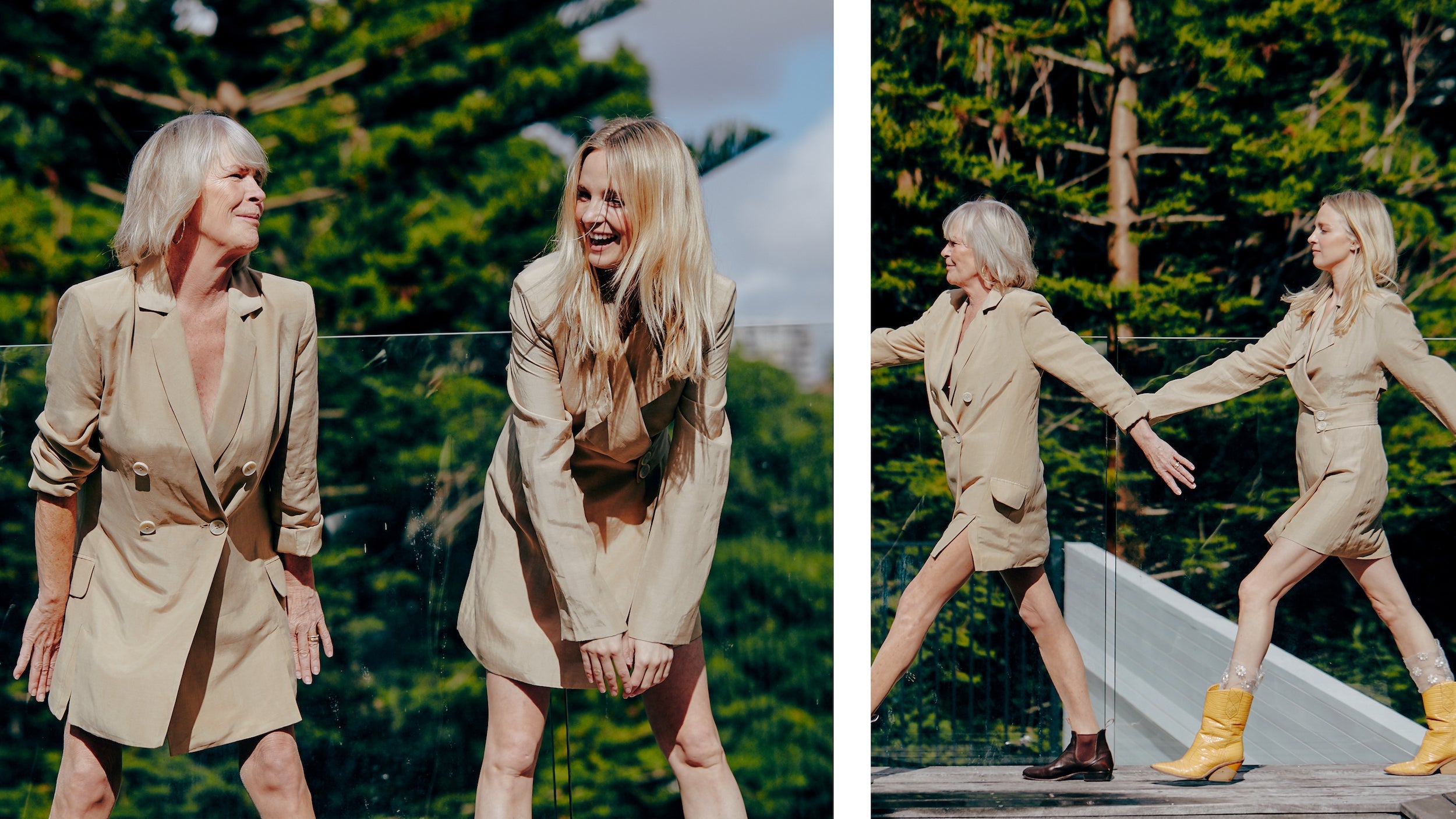 Sharon wears the Leon Blazer, Nadia wears the Leon Long Sleeve Mini Dress