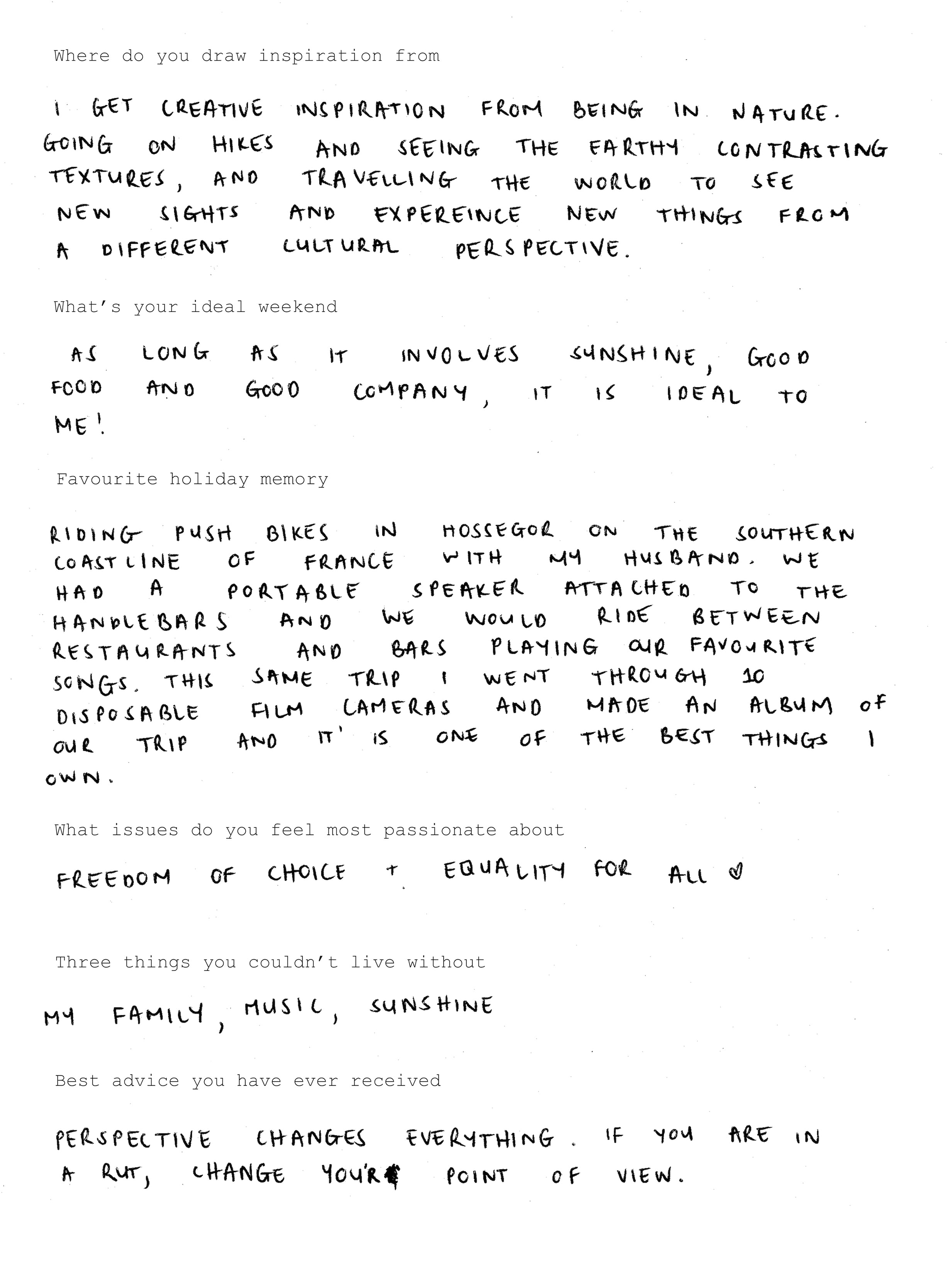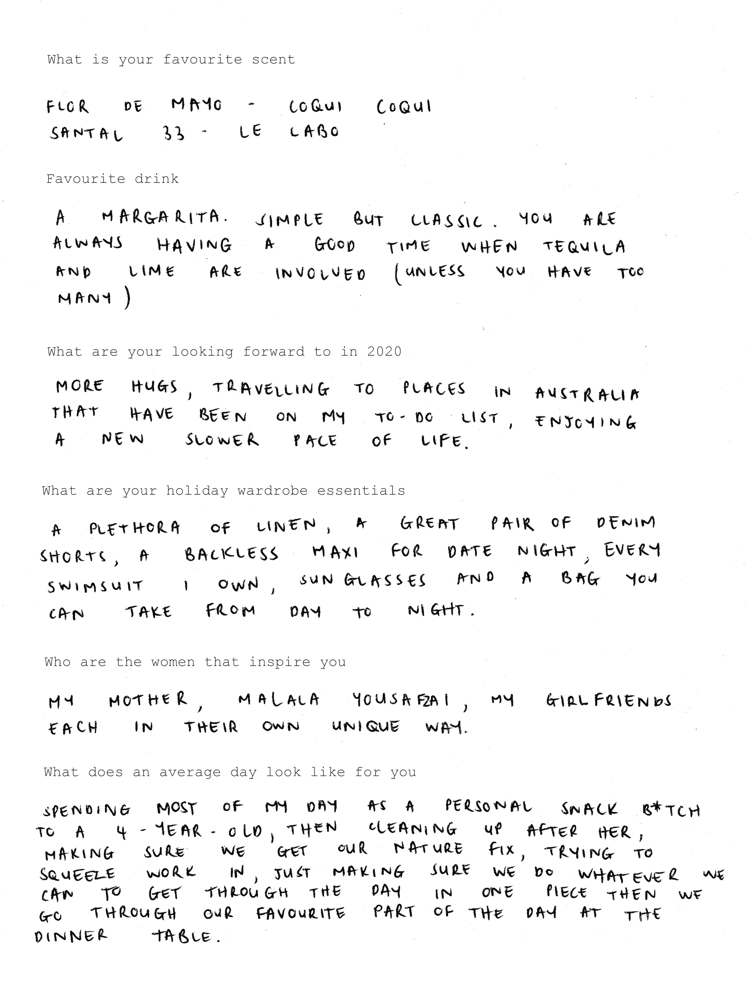 In this hand written interview Bec shares her favourite holiday memory and what she is looking forward to in 2020.