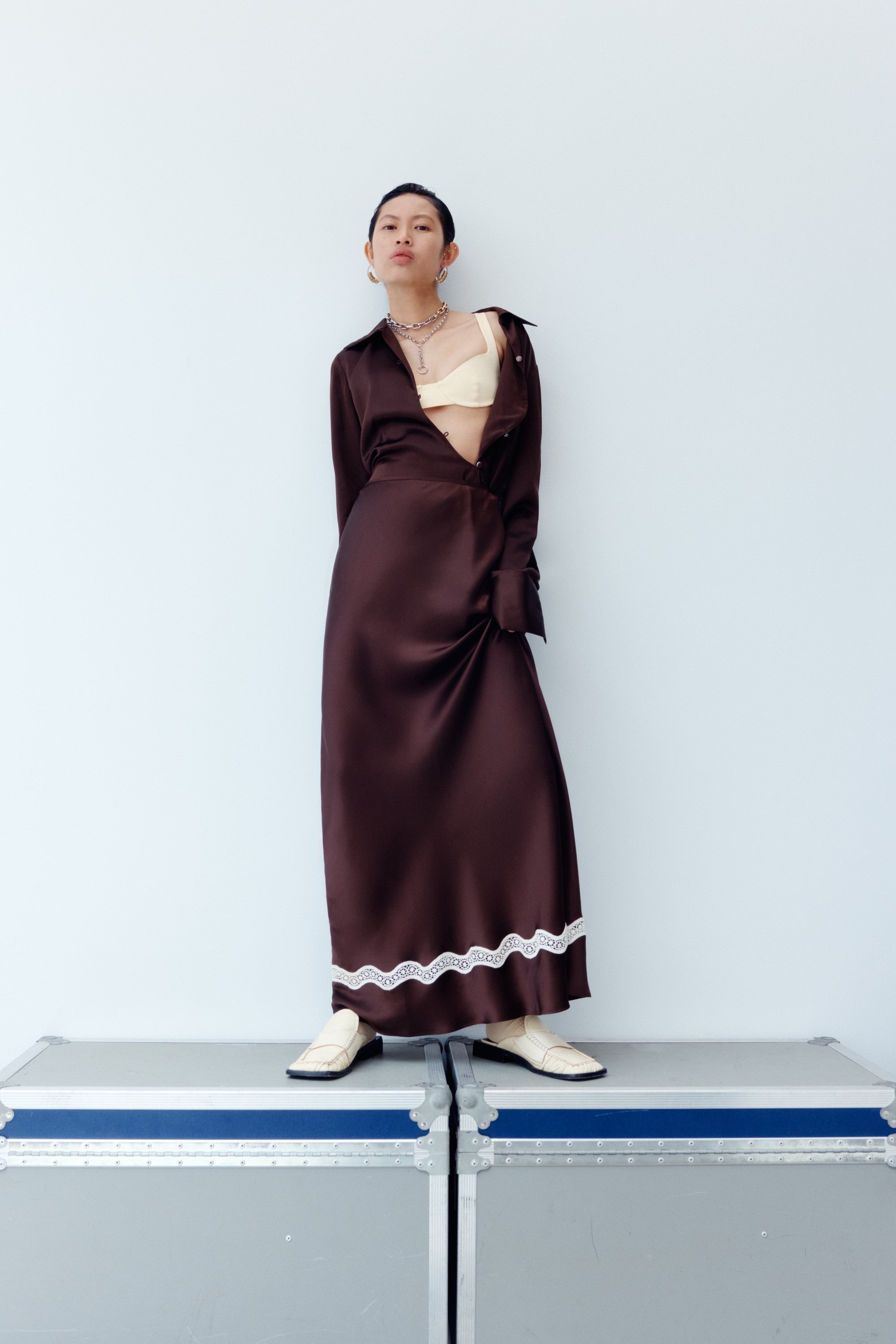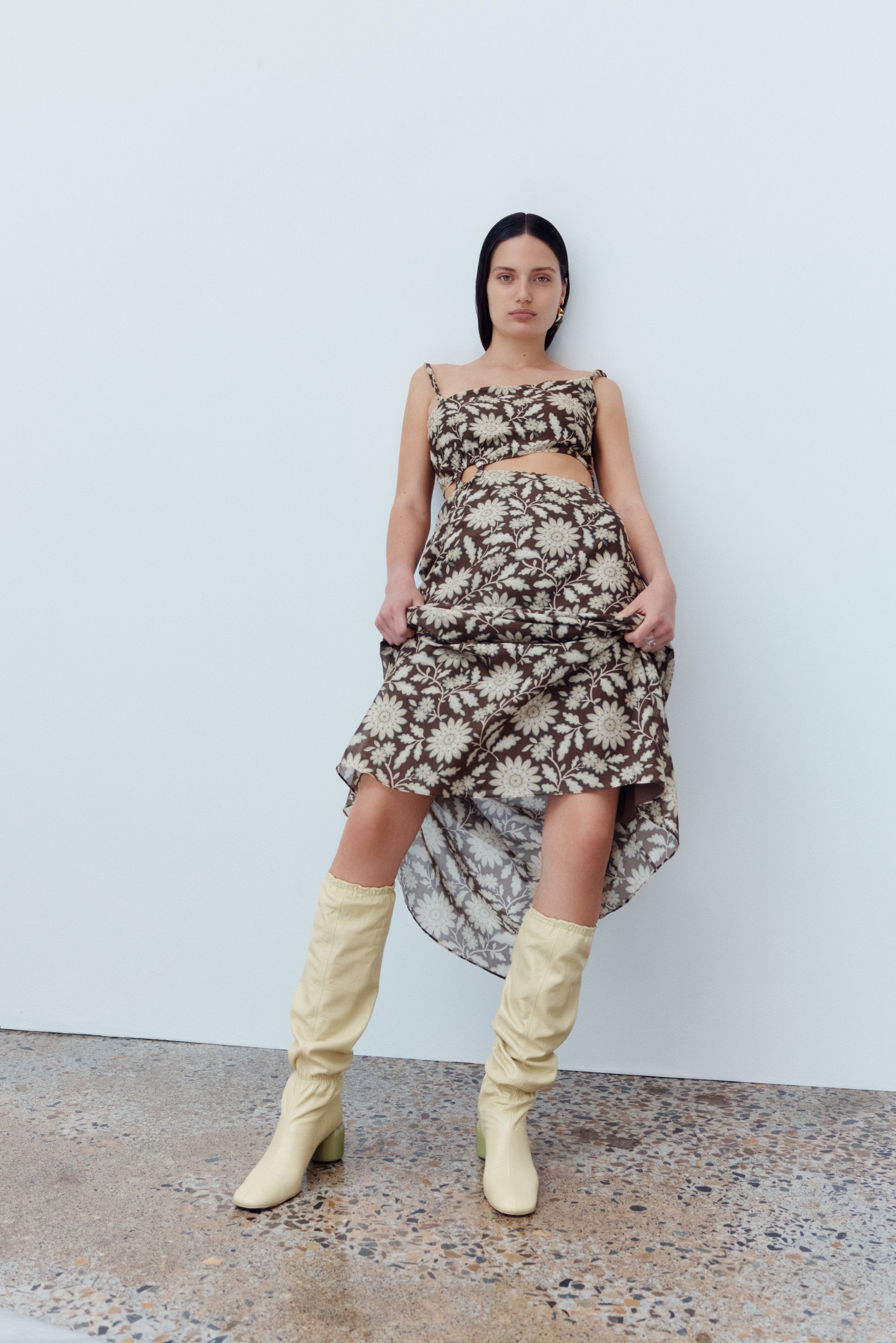 Exclusive prints nod to the 70s through swirling pastels and fluid fabrics. Finite slits follow the body's curvature with a sonic sensibility, while vintage florals are cast across feminine silhouettes. Silk profiles in rich chocolate and candy pink are finished with crochet and lace details, lending to a quintessential SIR feeling.