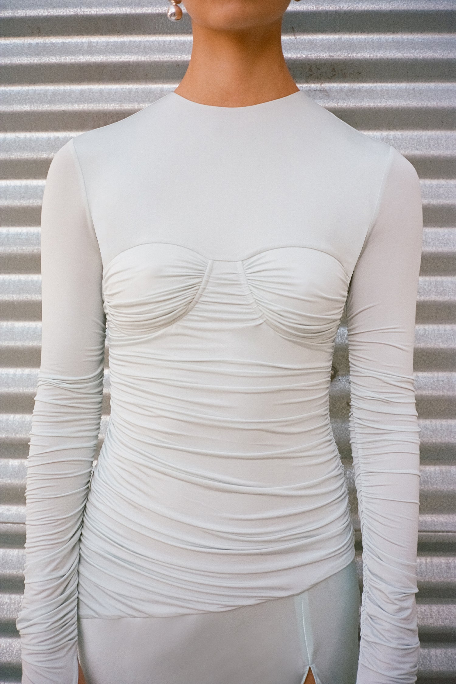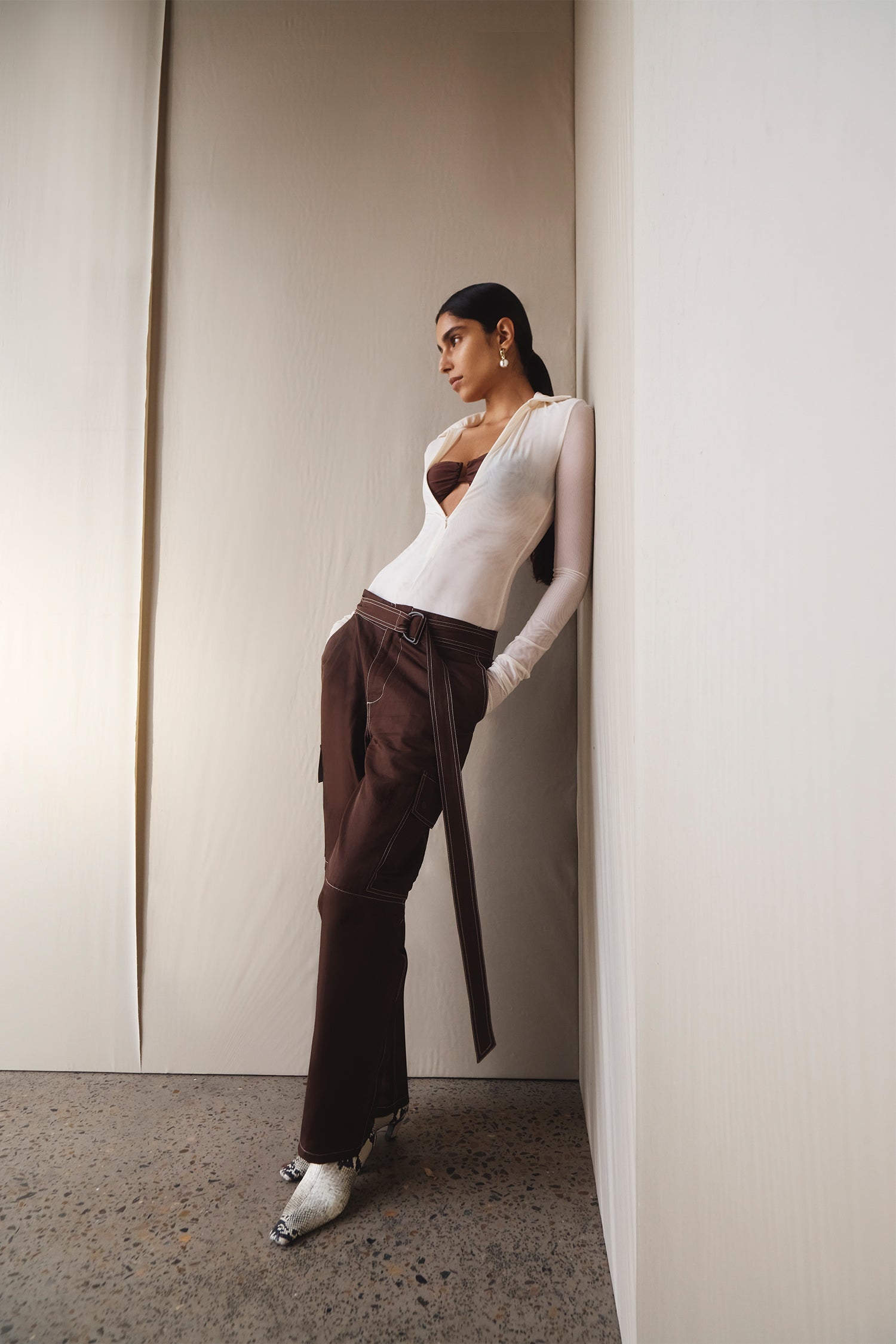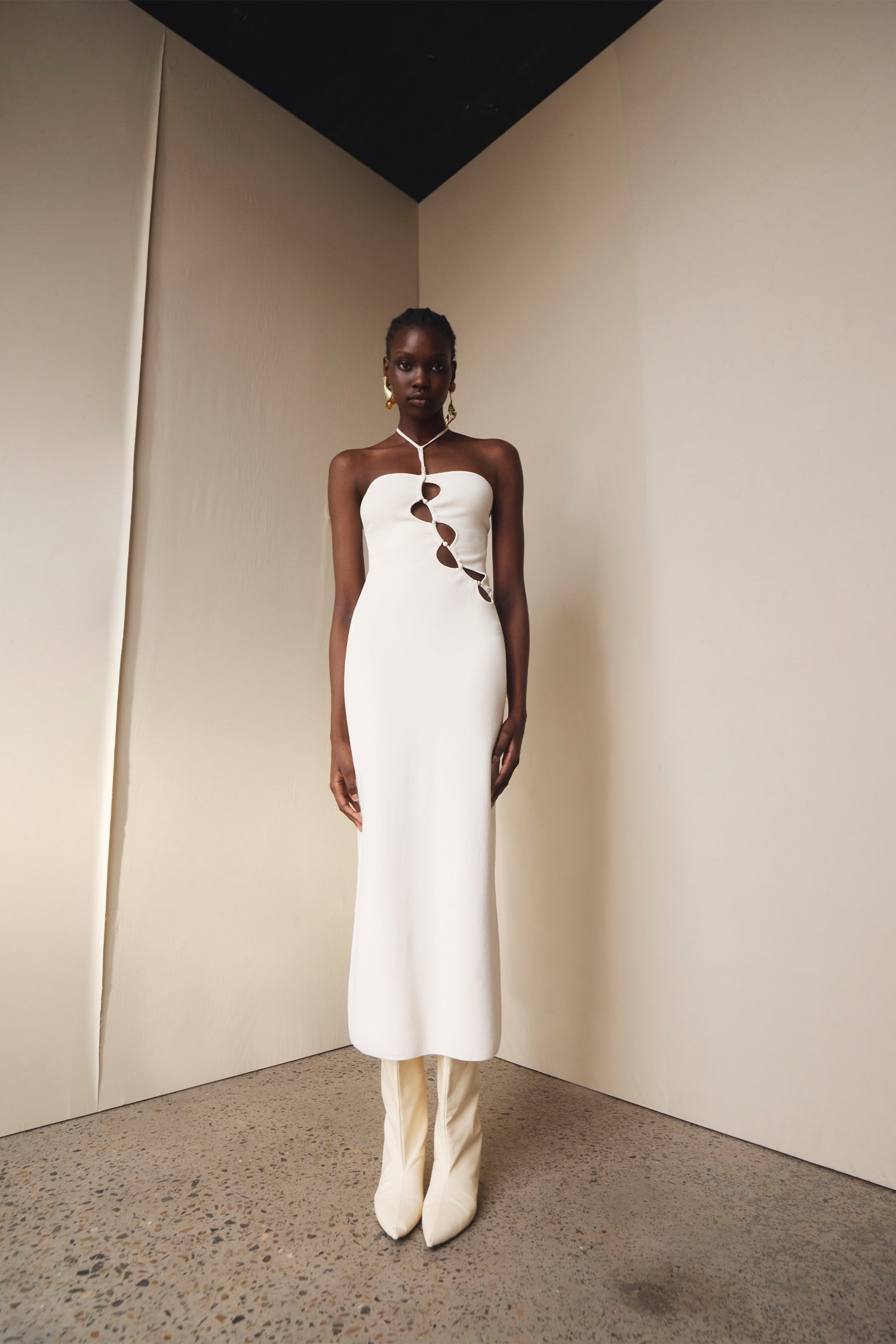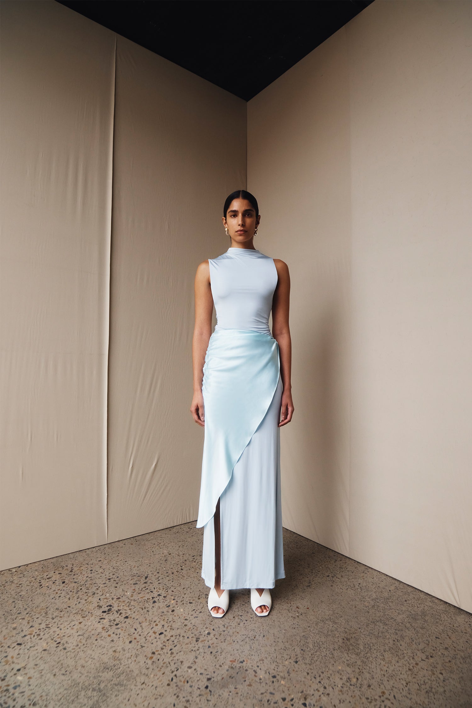 Draping techniques are used to highlight form fitting shapes, an ode to renaissance sculptures. Compact knit stories with stacked beads bring an air of movement, while mesh basics return in a new season palette expanding the brand's repertoire of elevated basics. Classic SIR. tailoring is deconstructed from traditional silhouettes and modernised with tonal hardware.
