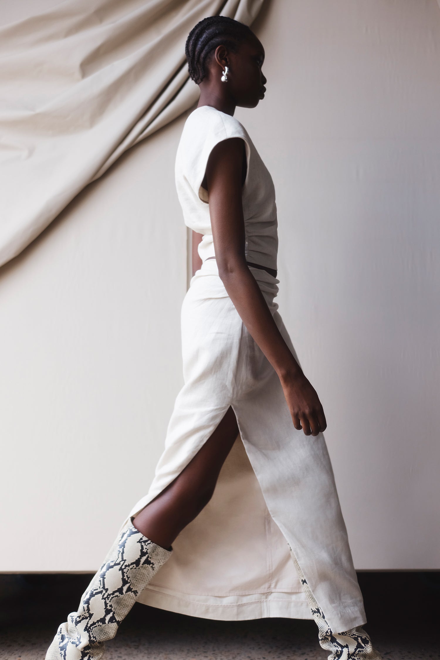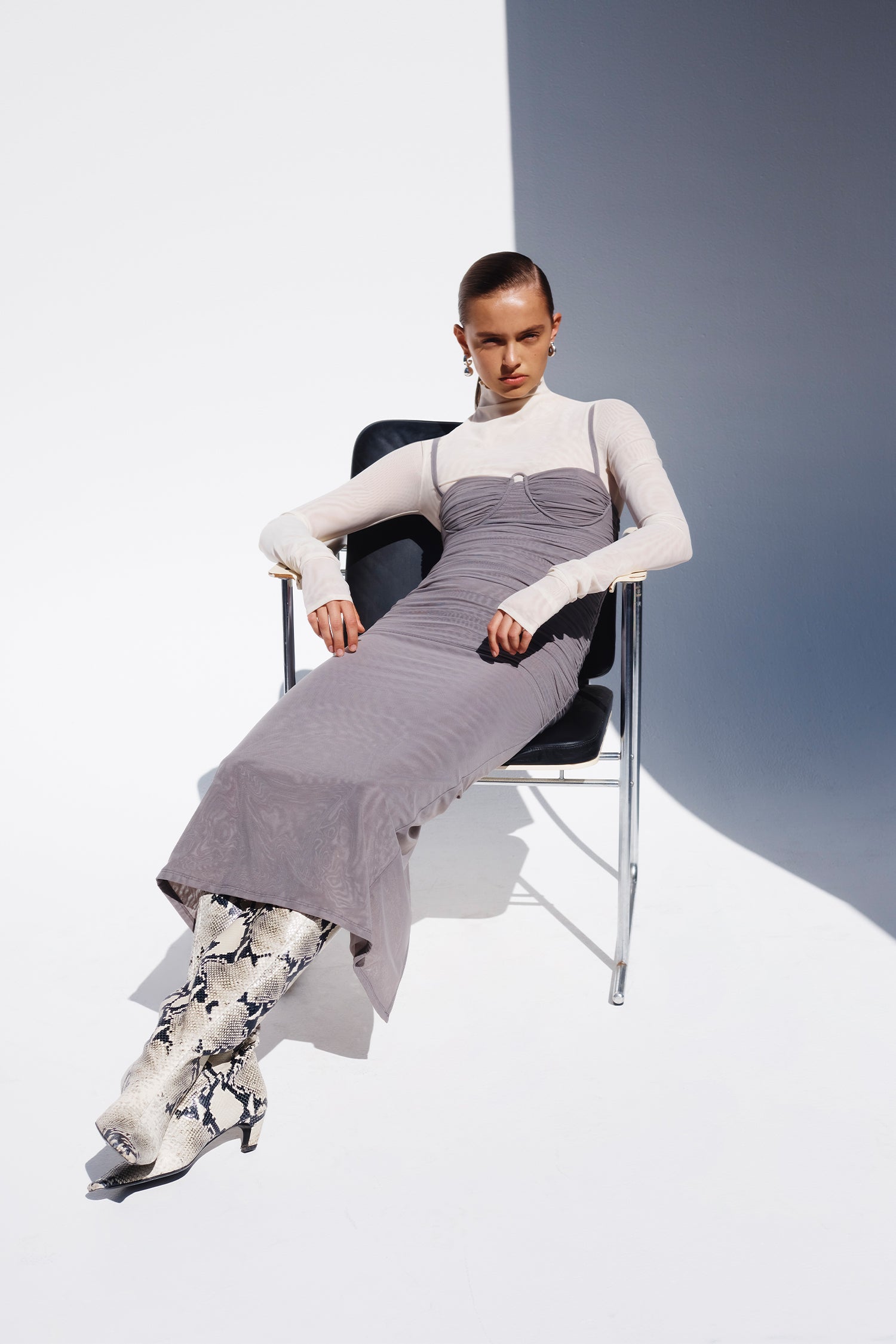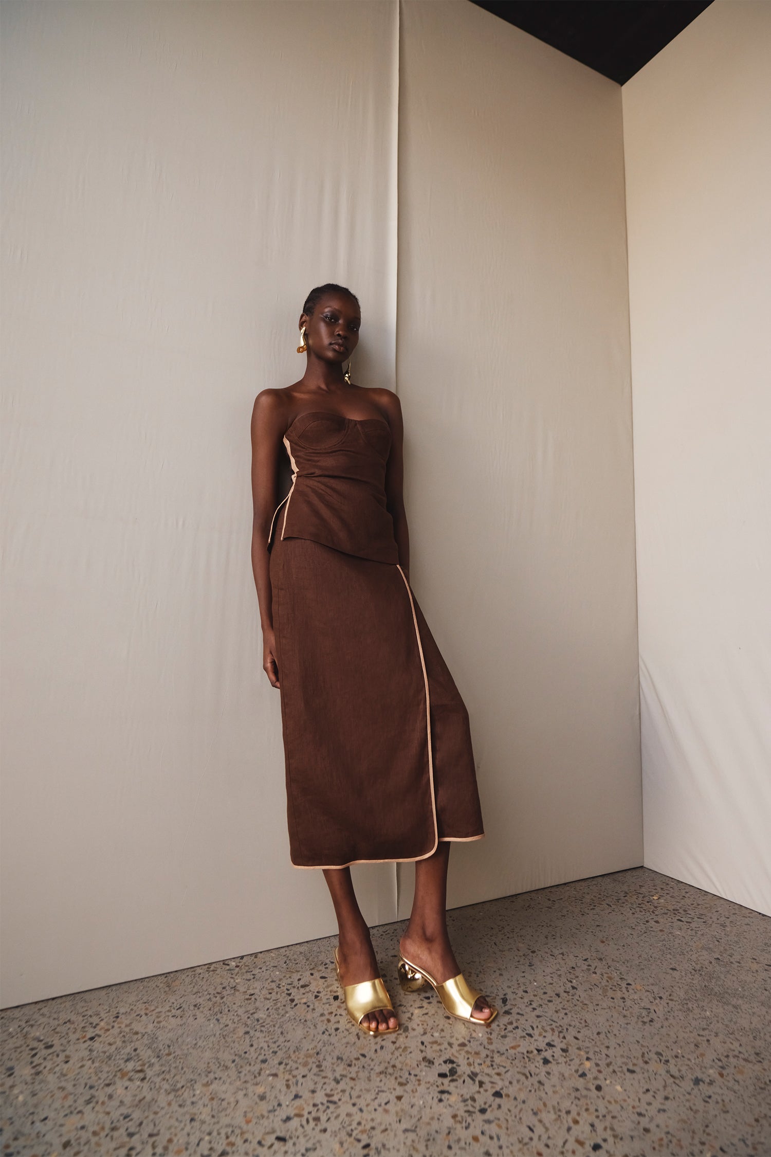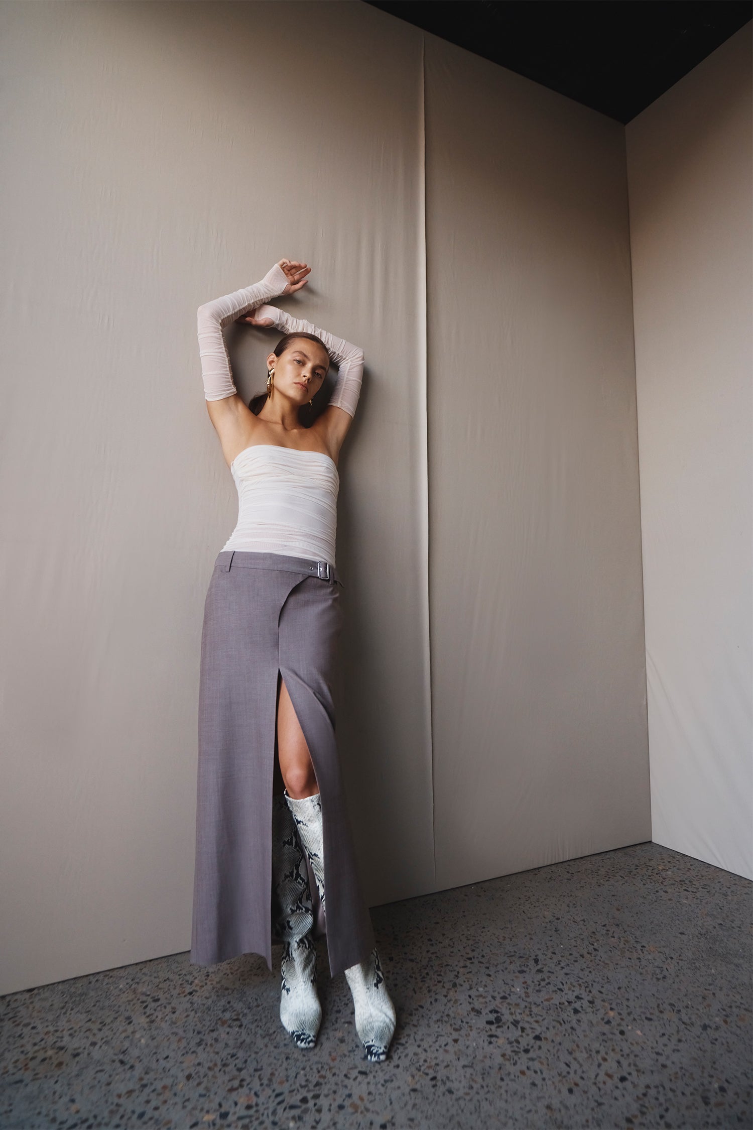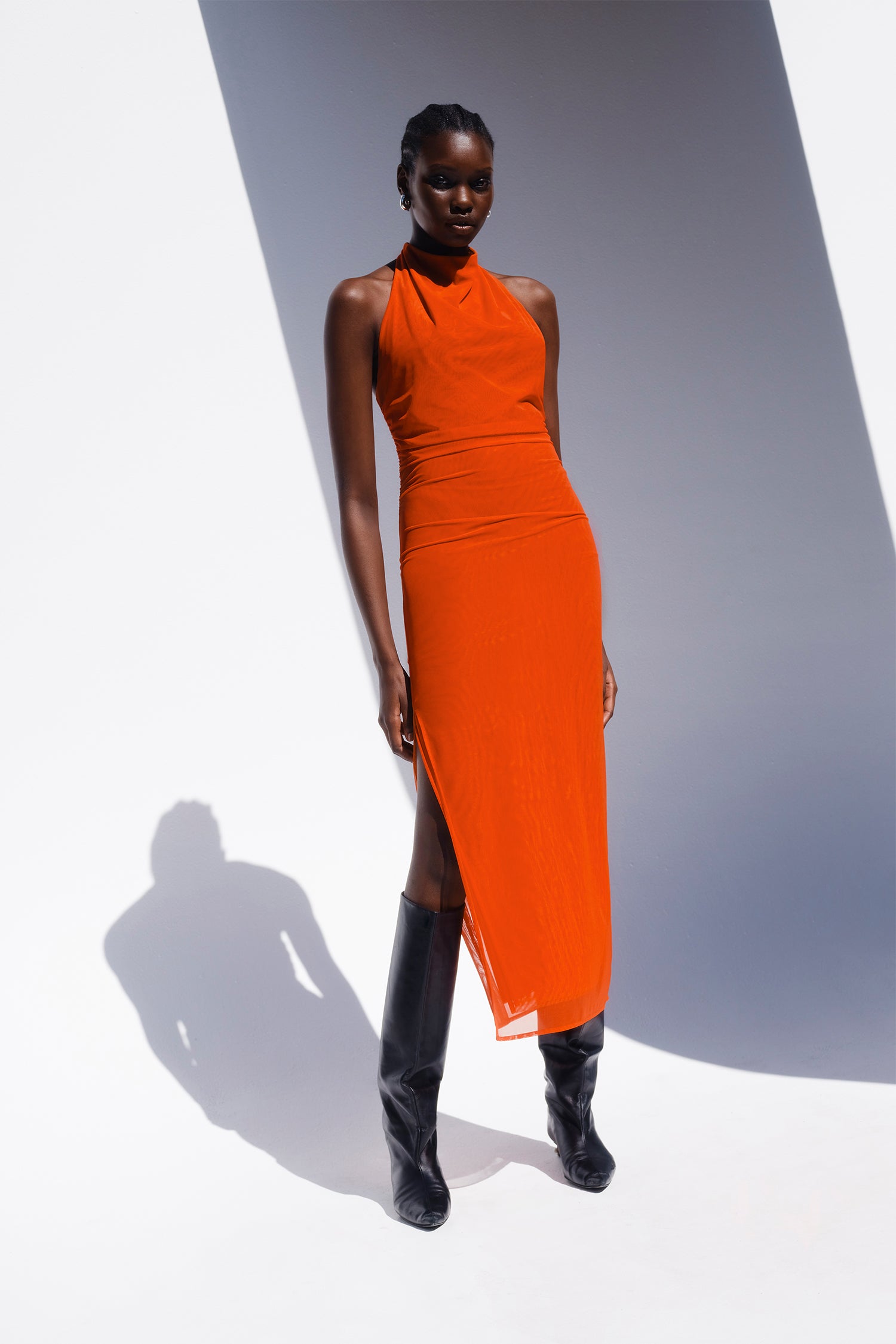 Draping techniques are used to highlight form fitting shapes, an ode to renaissance sculptures. Compact knit stories with stacked beads bring an air of movement, while mesh basics return in a new season palette expanding the brand's repertoire of elevated basics. Classic SIR. tailoring is deconstructed from traditional silhouettes and modernised with tonal hardware.