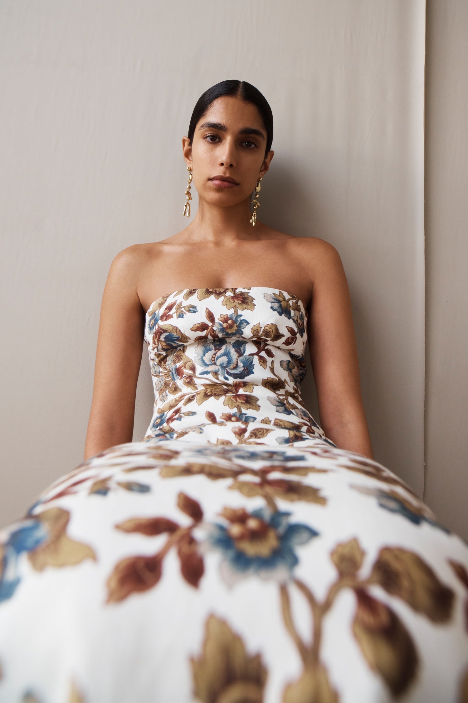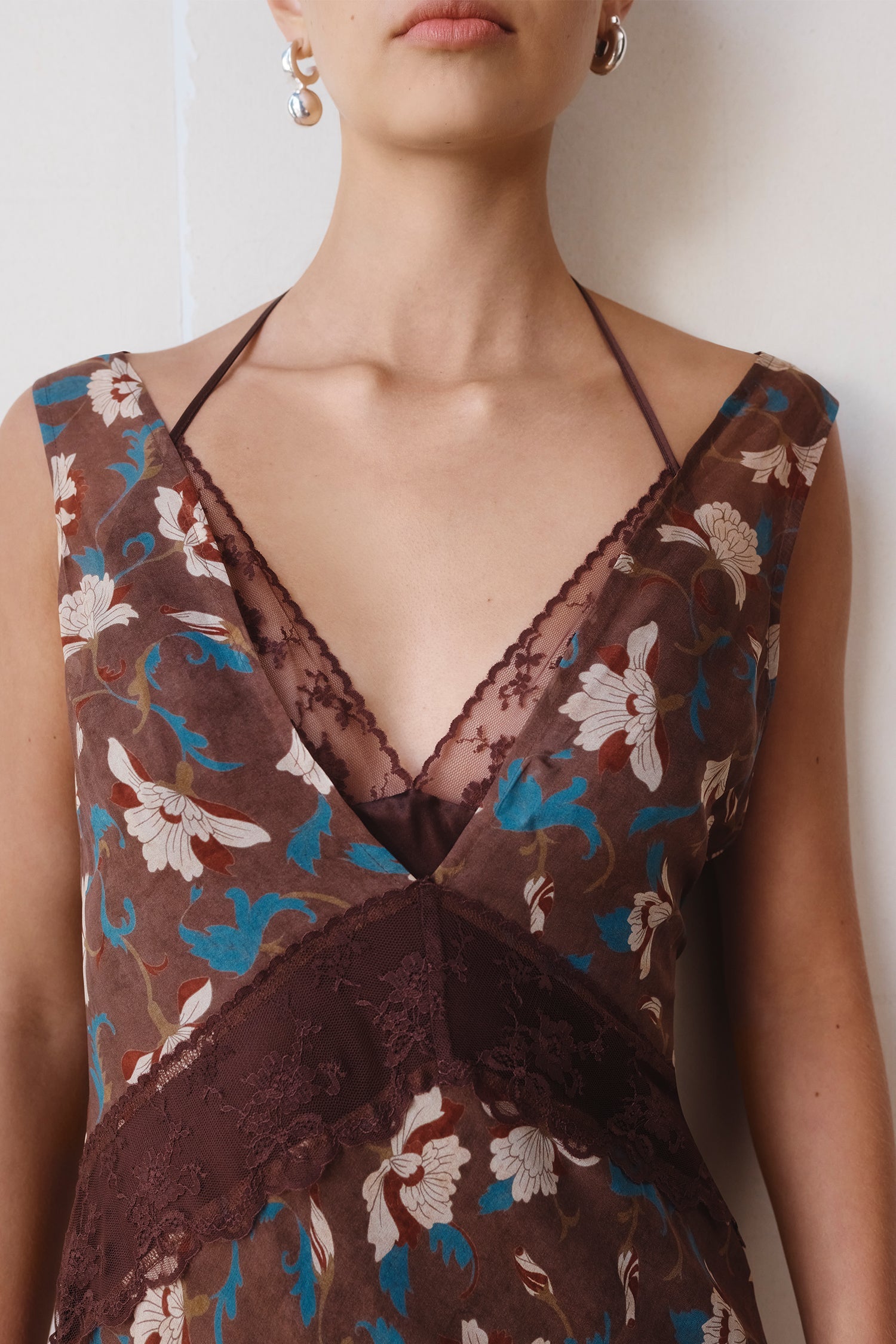 Prints and palettes reflect a rich decor. Tones of chocolate and golden yellow, contrast muted pastels in overlapping transparencies. Sicilian tile motifs in silk satin span across elegant separates and evening dresses. Vintage floral wallpaper prints in linen and soft chiffon, bordered with lace and corset detailing are a nod to boudoir lingerie.